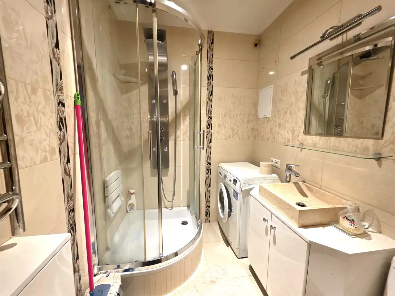 Łazienka w jasnej tonacji z kabiną prysznicową, pralką.