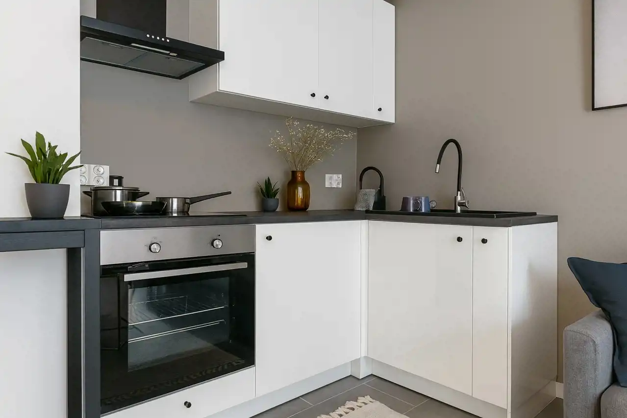 Kuchnia jest nowocześnie zaprojektowana, wyposażona w niezbędny sprzęt kuchenny.