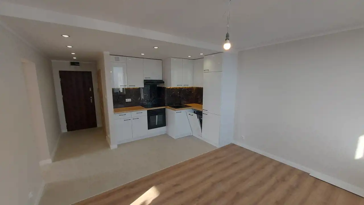 Nowoczesny aneks kuchenny: W pełni wyposażony w nowe meble oraz sprzęt AGD (w cenie mieszkania!).