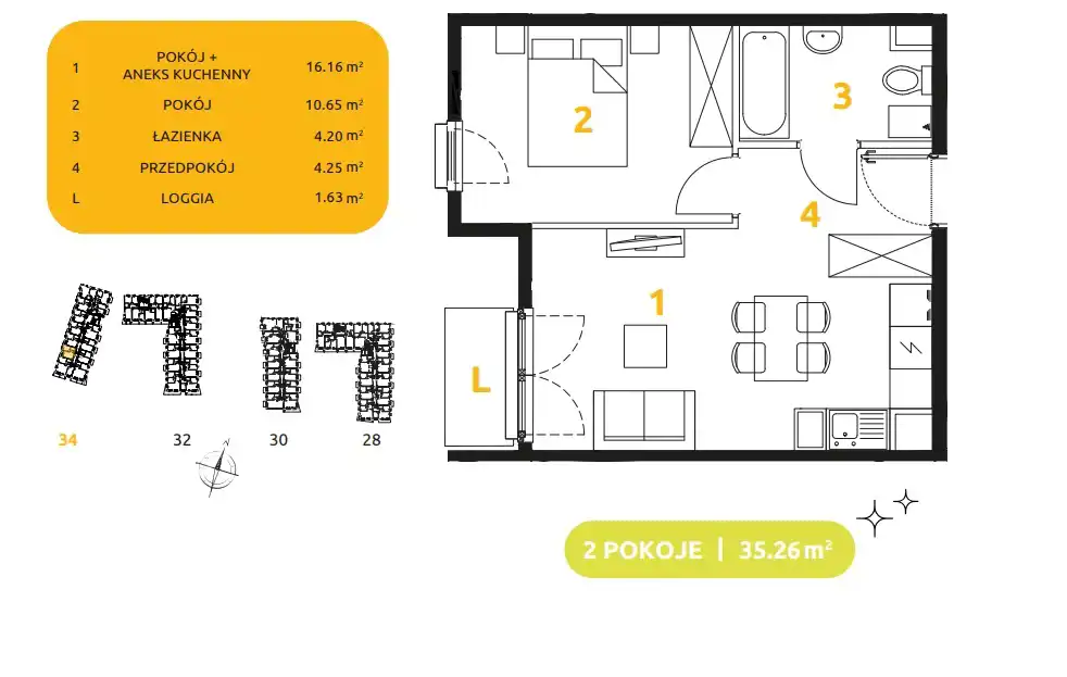 - Charakterystyka mieszkania 35.26 m2, 2 pokoje