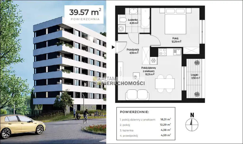 - Charakterystyka mieszkania 39.57 m2, 2 pokoje
