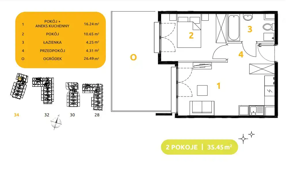 - Charakterystyka mieszkania 35.45 m2, 2 pokoje