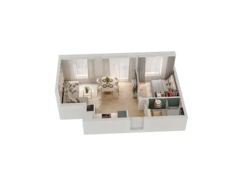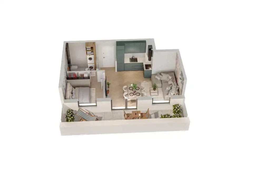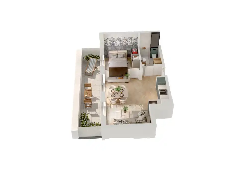 Mieszkanie składające się z salonu z aneksem kuchennym ,sypialni, przedpokoju, łazienki oraz tarasu o pow. 10m2