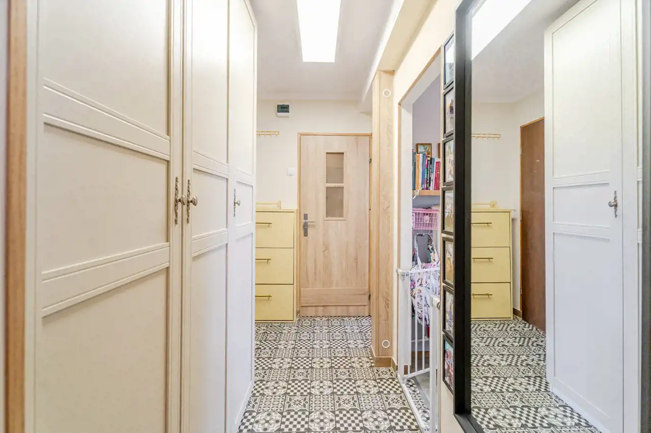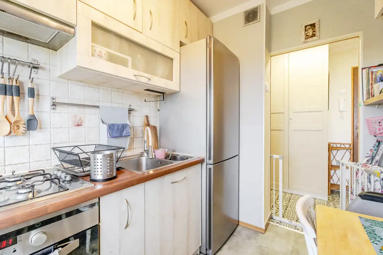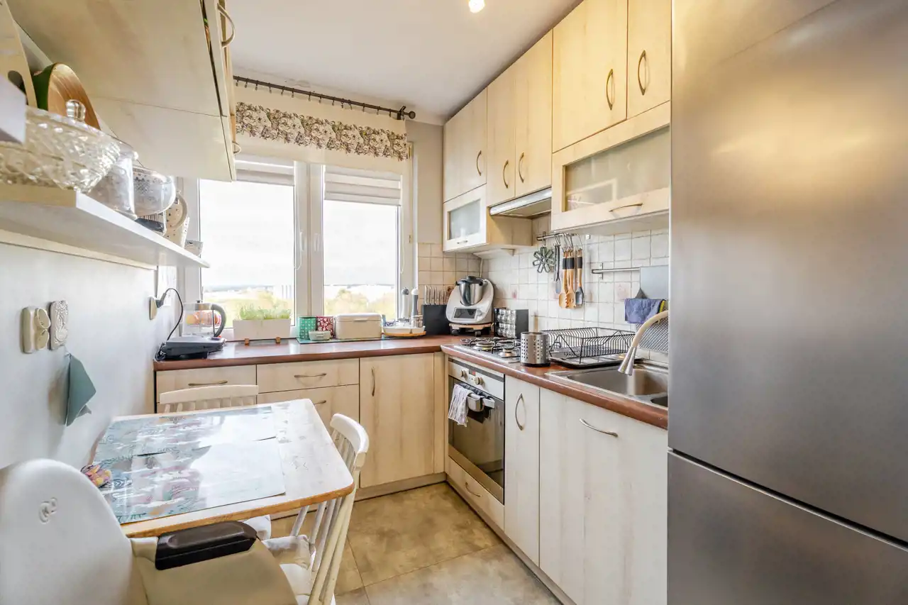 W przedpokoju znalazło się miejsce na pojemną szafę. Kuchnia jest wyposażona w płytę gazową, piekarnik, lodówko-zamrażarkę, okap oraz oczywiście zlewozmywak z zabudową kuchenną. Znalazło się również miejsce na stolik jadalniany. Salon z zabudowanym balkonem, pomieszczenie ustawne, na podłodze panele podłogowe o przyjemnym kolorze. Sypialnia, czyli drugi pokój ustawna i przestronna. Posadzka w przedpokoju i kuchni została wymieniona. Łazienka z wanną w której znalazło się również miejsce na pralkę.