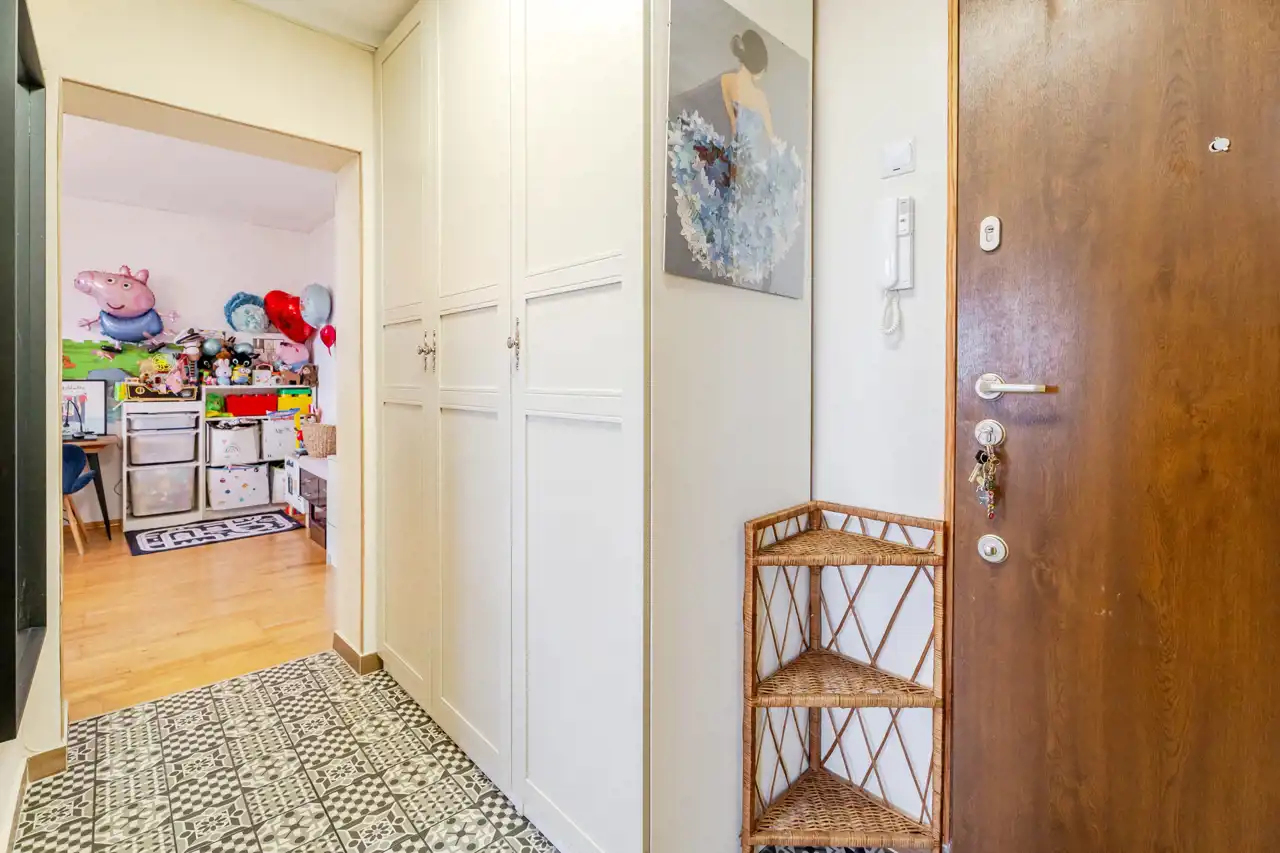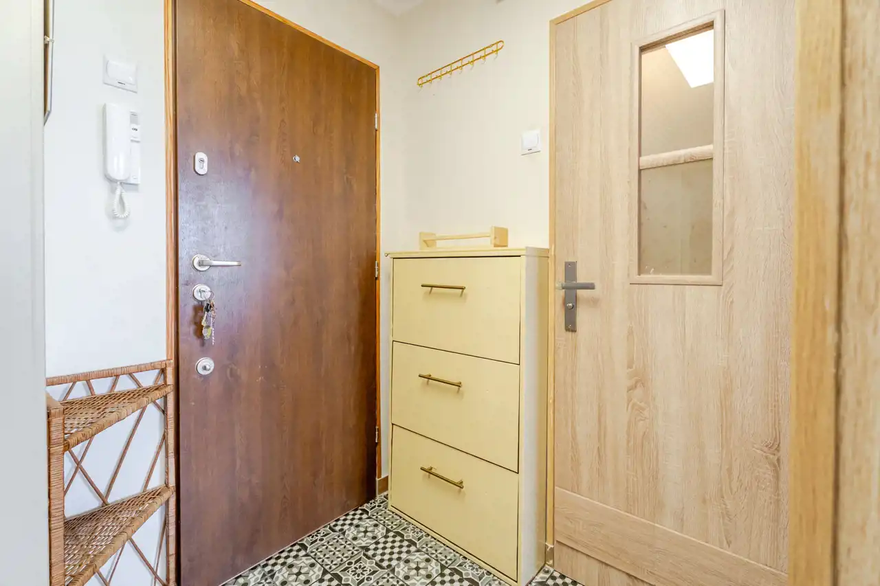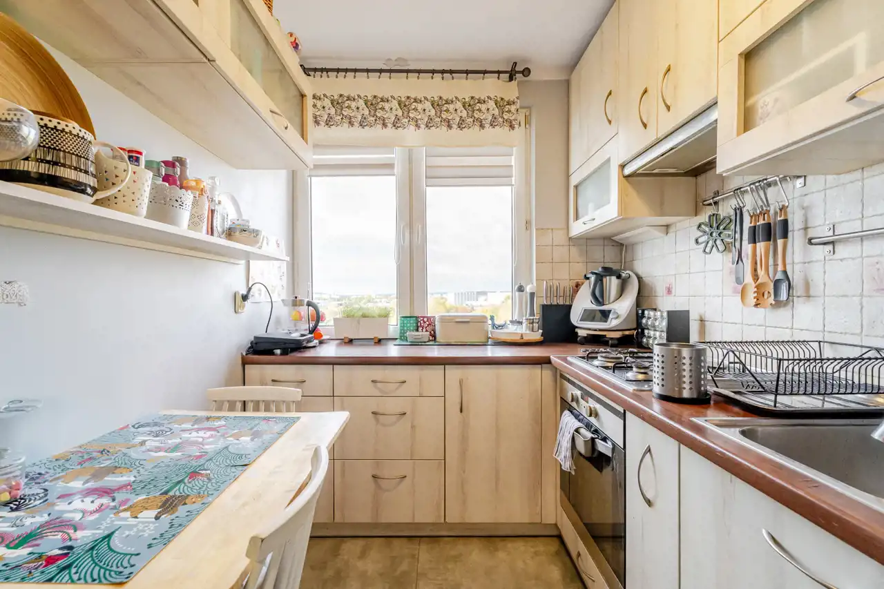 W przedpokoju znalazło się miejsce na pojemną szafę. Kuchnia jest wyposażona w płytę gazową, piekarnik, lodówko-zamrażarkę, okap oraz oczywiście zlewozmywak z zabudową kuchenną. Znalazło się również miejsce na stolik jadalniany. Salon z zabudowanym balkonem, pomieszczenie ustawne, na podłodze panele podłogowe o przyjemnym kolorze. Sypialnia, czyli drugi pokój ustawna i przestronna. Posadzka w przedpokoju i kuchni została wymieniona. Łazienka z wanną w której znalazło się również miejsce na pralkę.