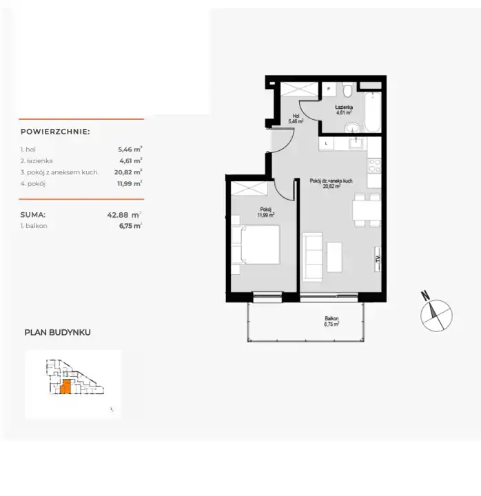 - Charakterystyka mieszkania 43.06 m2, 2 pokoje