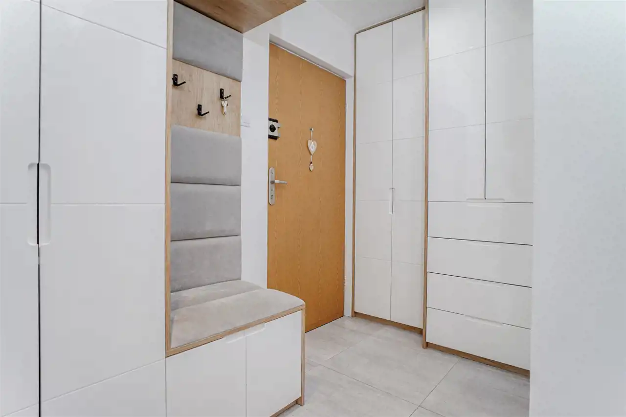 - przedpokój z pojemnymi szafami w zabudowie i praktycznym siedziskiem.