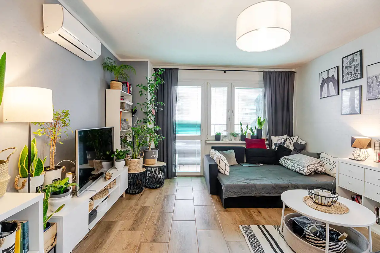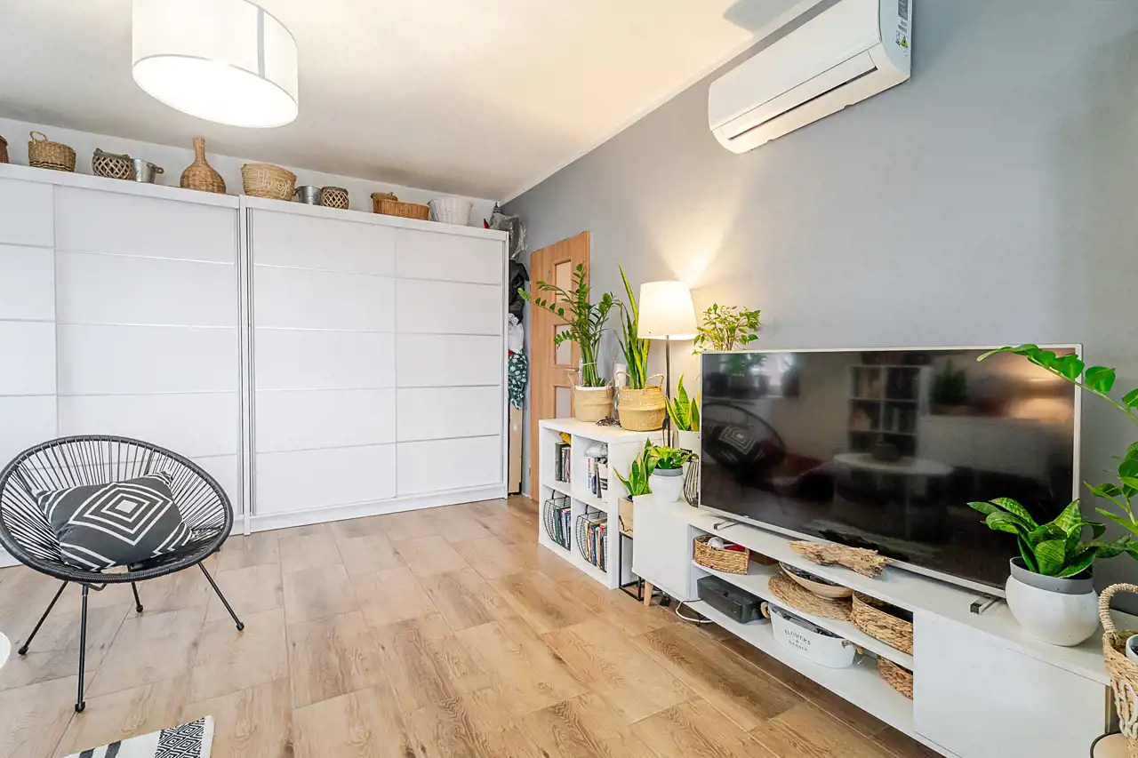 W dużym pokoju zamontowana klimatyzacja (z funkcją grzania i chłodzenia).