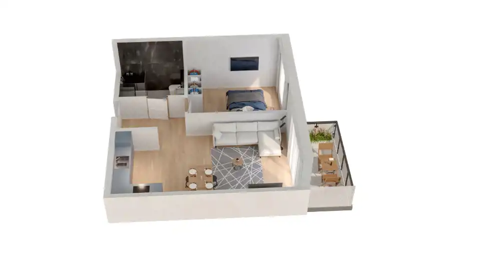 Mieszkanie składające się z salonu z aneksem kuchennym , sypialni, przedpokoju, łazienki oraz balkonu