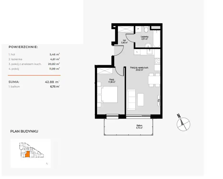 - Charakterystyka mieszkania 42.88 m2, 2 pokoje