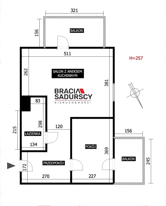 Na powierzchnie mieszkania składa się: salon z aneksem kuchennym o pow. ok 18 m2 z wyjściem na duży balkon (ok 5m2) - ekspozycja południowa i zachodnia, niewielka sypialnia o pow. 8,4 m2, ale z miejscem na łóżko i pojemną szafę w zabudowie z wyjściem na drugi balkon (ok 3,8 m2) - ekspozycja zachodnia; łazienka z wc oraz przedpokój z kolejną, bardzo dużą szafą na wymiar.