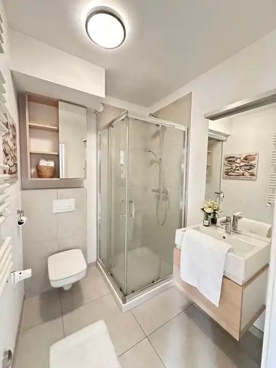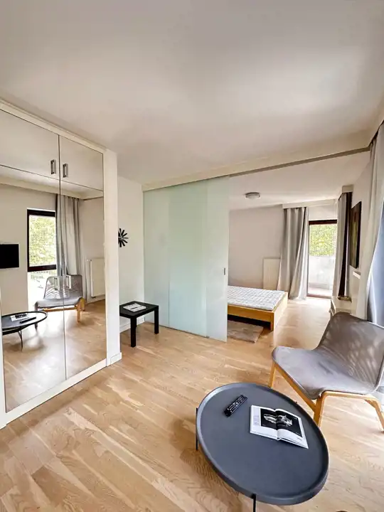 - salon z aneksem kuchennym z wydzieloną częścią sypialnianą ( szklane drzwi), łazienka z toaletą