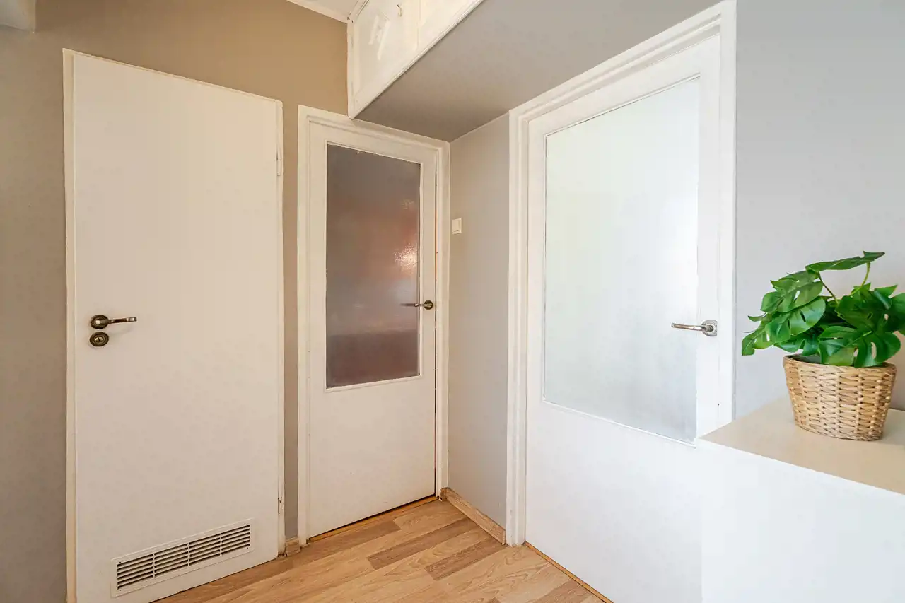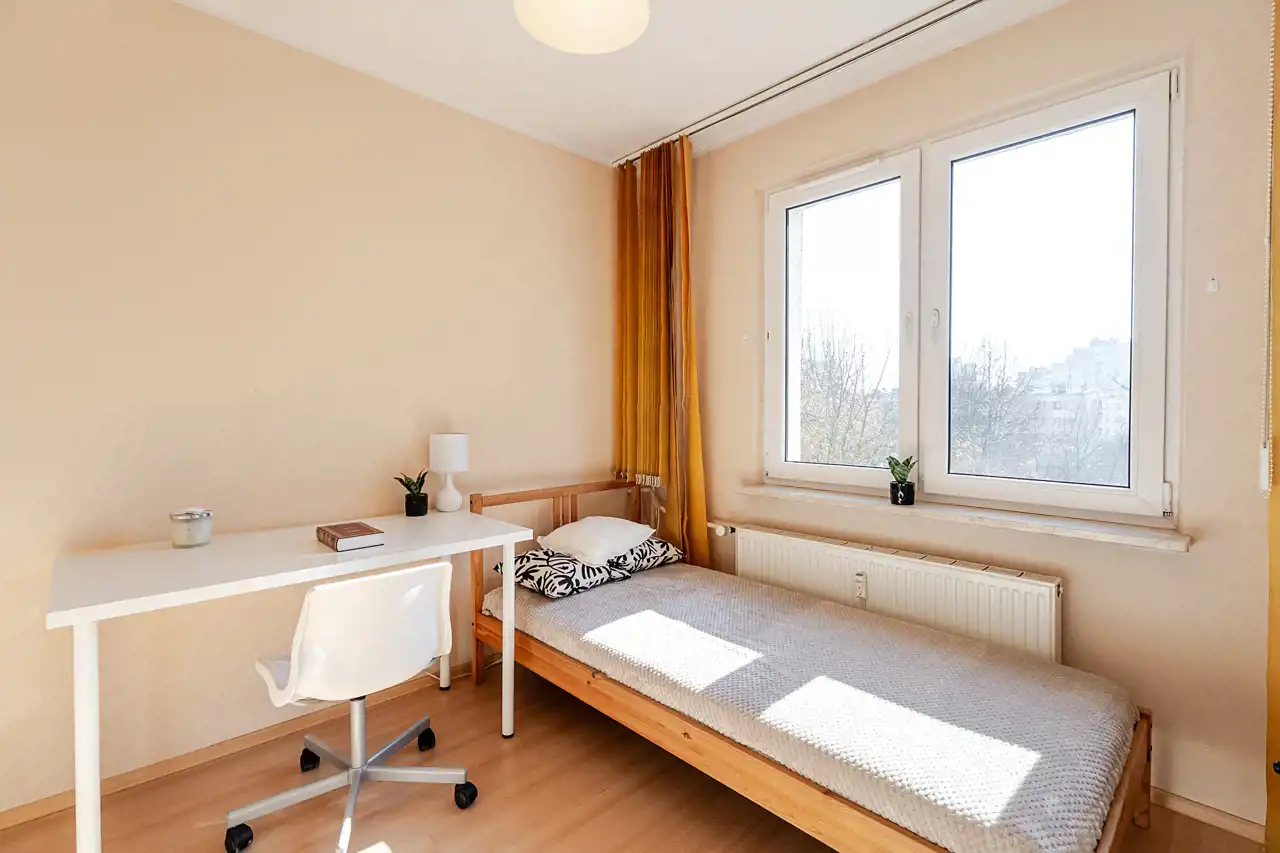 Wnętrze ma układ, który dziś jest rzadko spotykany na takim metrażu: trzy niezależne pokoje (13,8 / 9 / 6 m²), osobna kuchnia z oknem, łazienka, oddzielne WC oraz przedpokój. Dwustronna ekspozycja sprawia, że światło towarzyszy tu przez cały dzień.