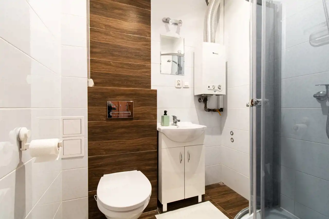 - Ogrzewanie z sieci miejskiej, ciepła woda z piecyka gazowego