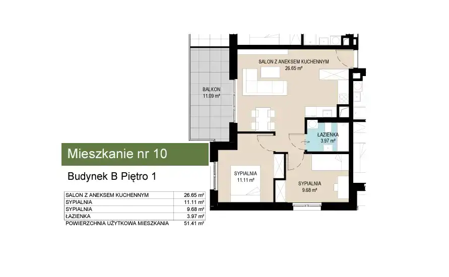 - Charakterystyka mieszkania 51.41 m2, 3 pokoje