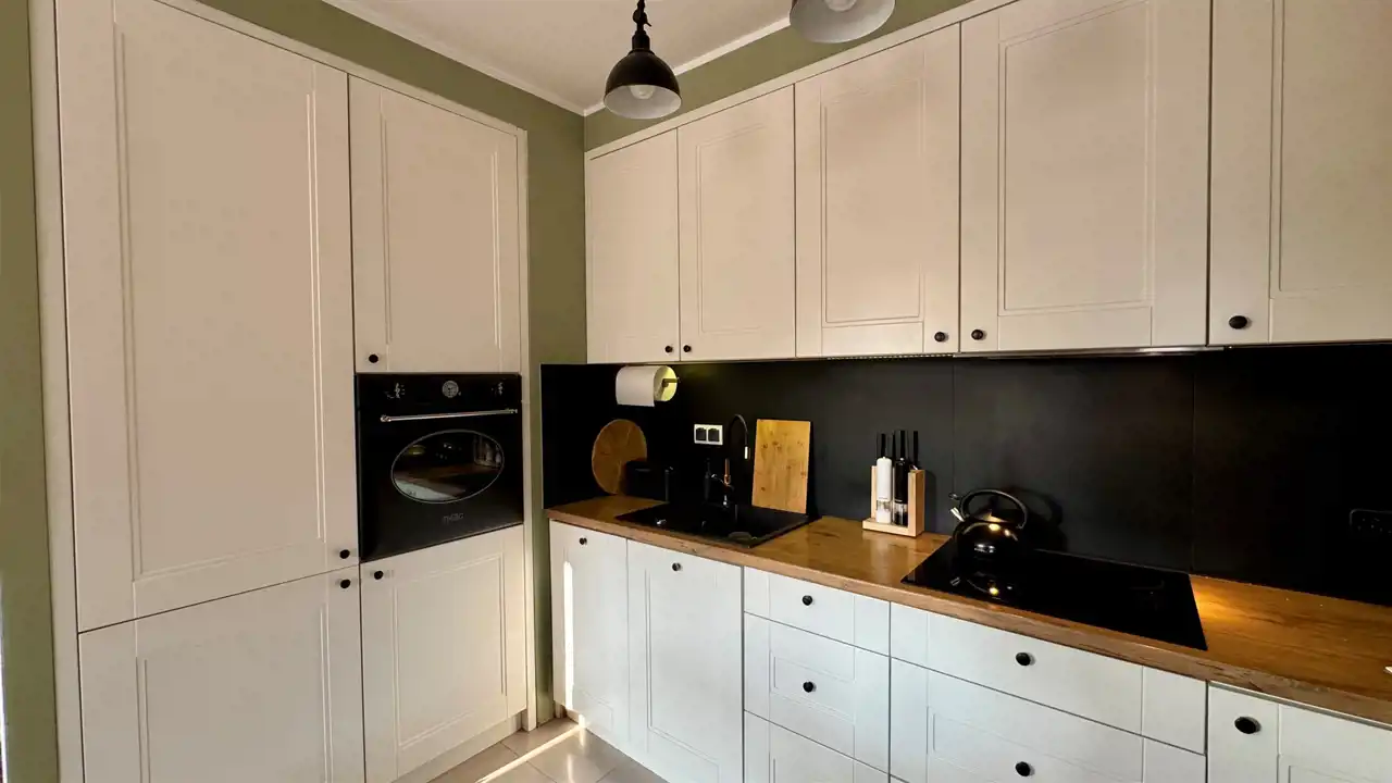 funkcjonalny, pieknie zaprojektowany aneks kuchenny z kompletnym sprzętem AGD i dużą ilością miejsca do przechowywania
