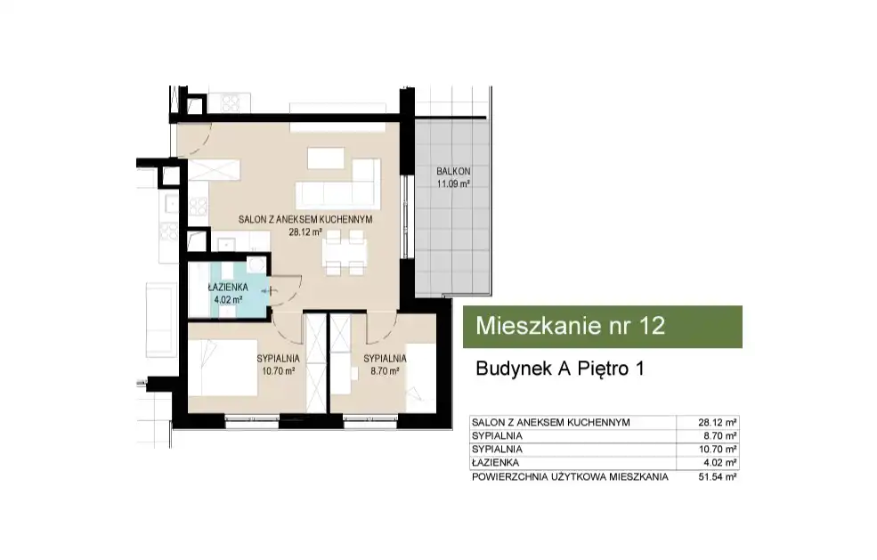 - Charakterystyka mieszkania 51.54 m2, 3 pokoje