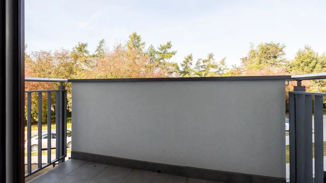 Balkon z widokiem na zieleń, ekspozycja zachodnia.