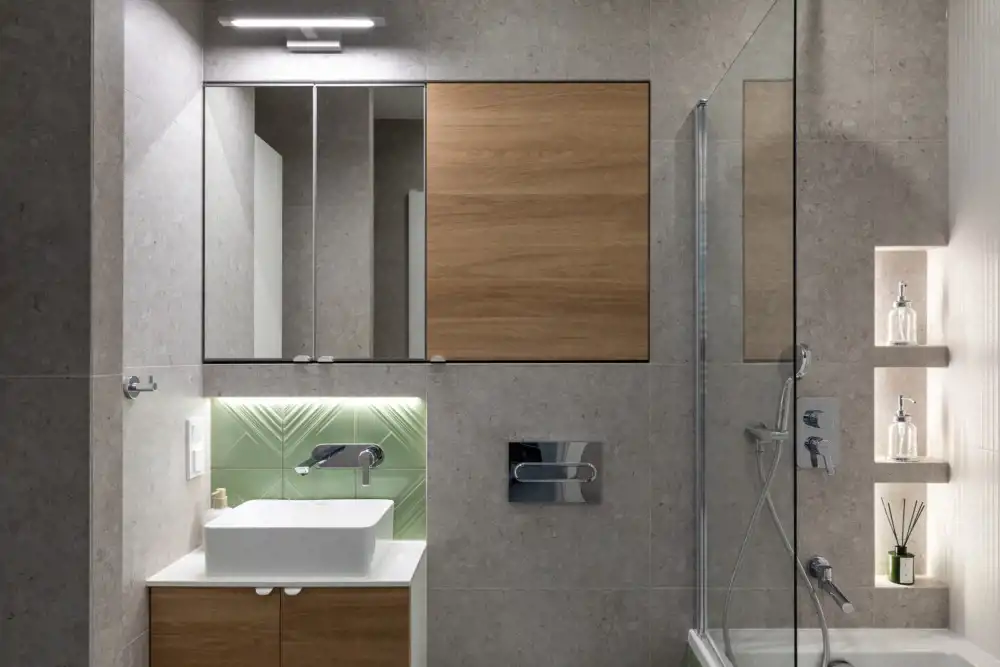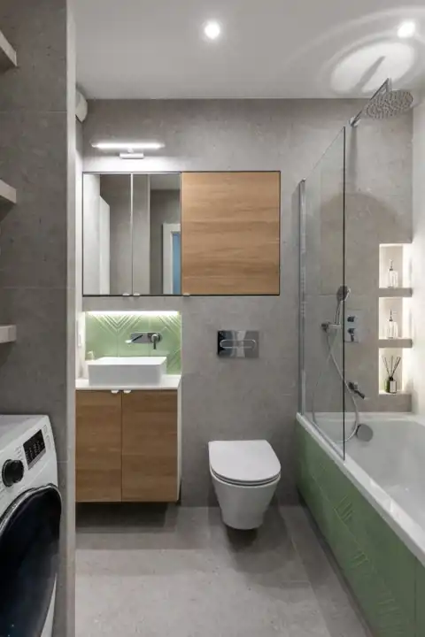 Na podłodze nowoczesne panele AC5, w łazience płytki na całej wysokości ścian.