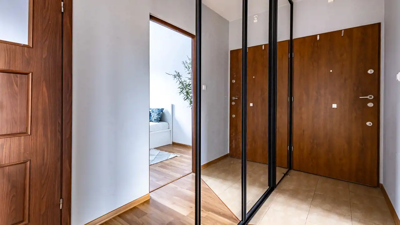 W przedpokoju jest duża szafa na wymiar z przesuwnymi lustrzanymi drzwiami.