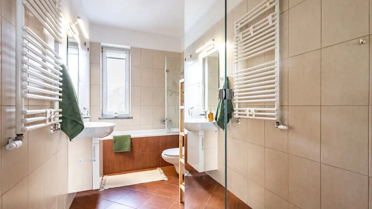 W łazience jest duża szafa PAX z lustrem, wanna z parawanem, umywalka z szafką, toaleta, regał, krzesło.