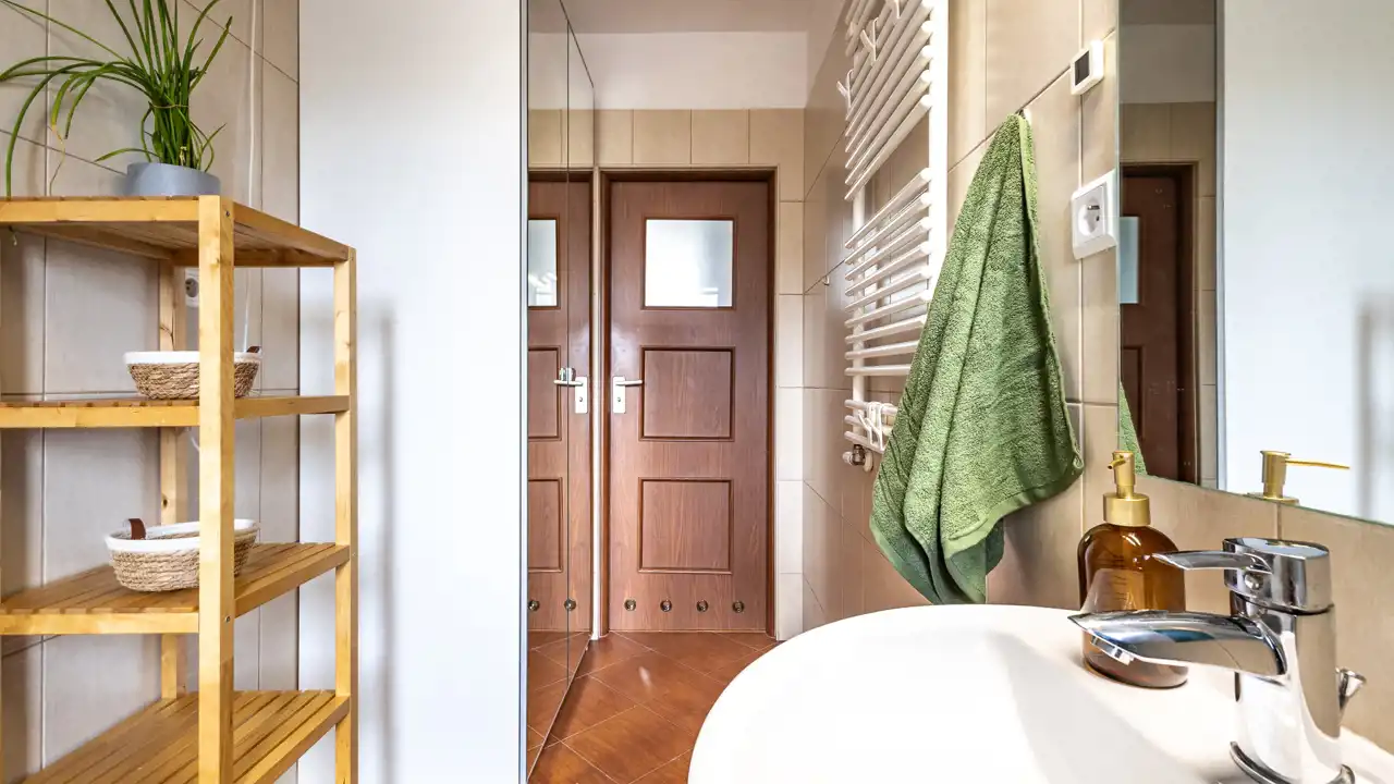 W przedpokoju jest duża szafa na wymiar z przesuwnymi lustrzanymi drzwiami.