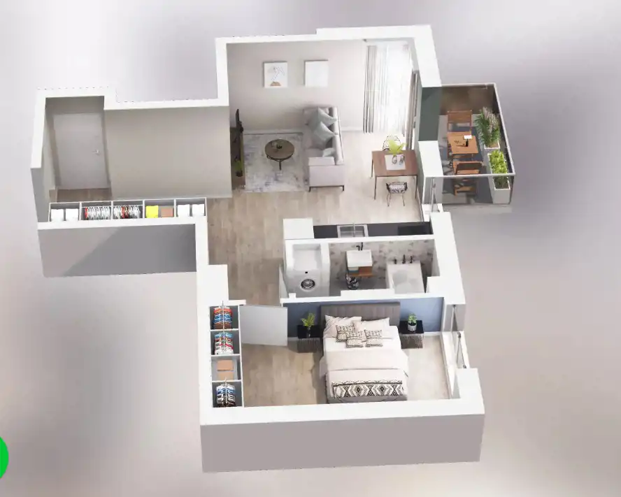 Mieszkanie składające się z salonu z aneksem kuchennym, sypialni, przedpokoju, łazienki oraz balkonu