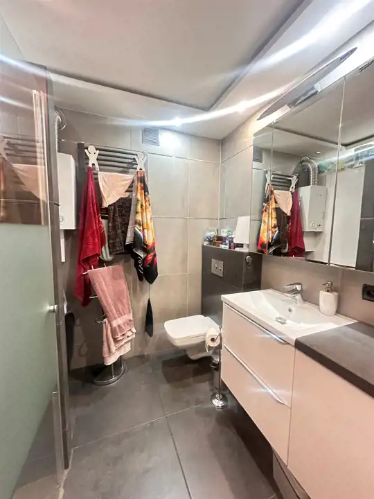 - Media Ogrzewanie: C.O. miejskie; Woda: ciepła - piecyk gazowy