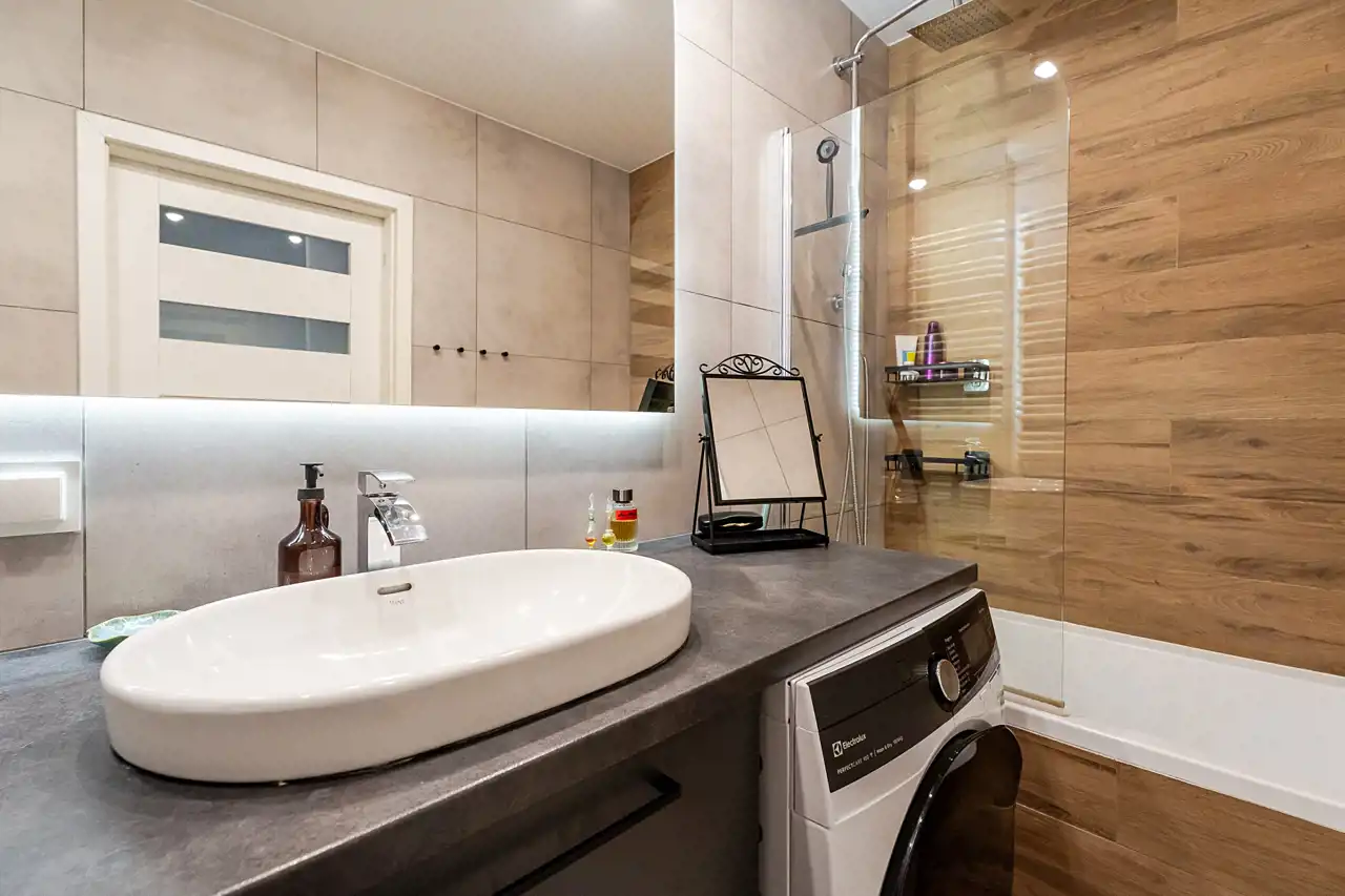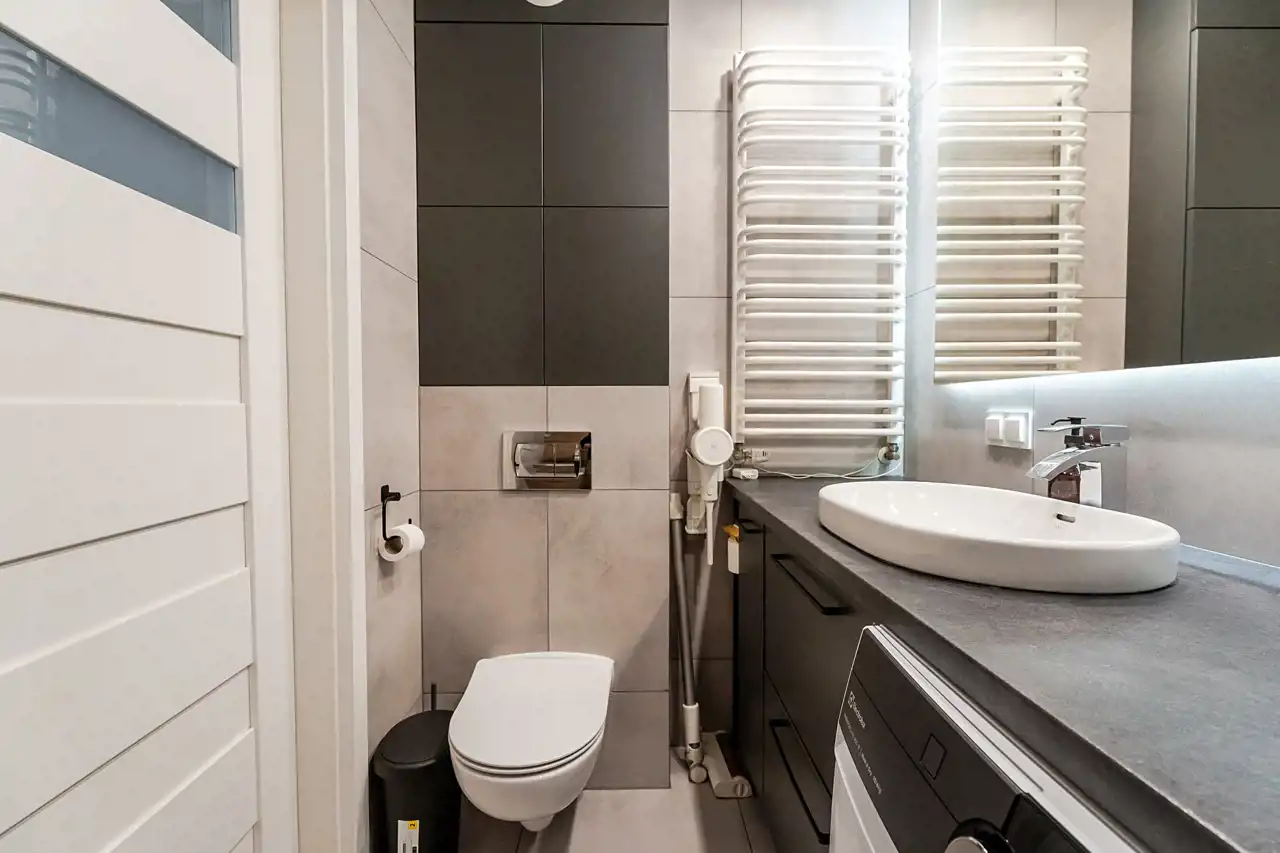 Na podłodze panele a w łazience terakota.