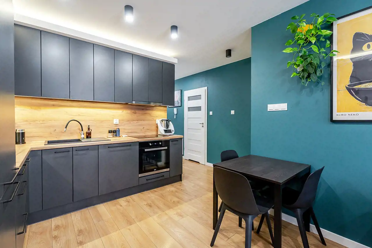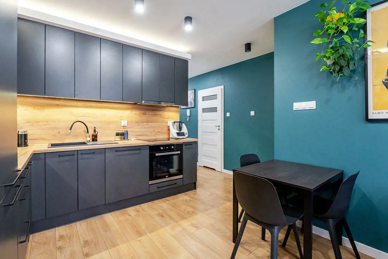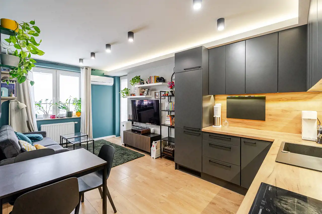 - salon z aneksem kuchennym oraz wyjściem na balkon,