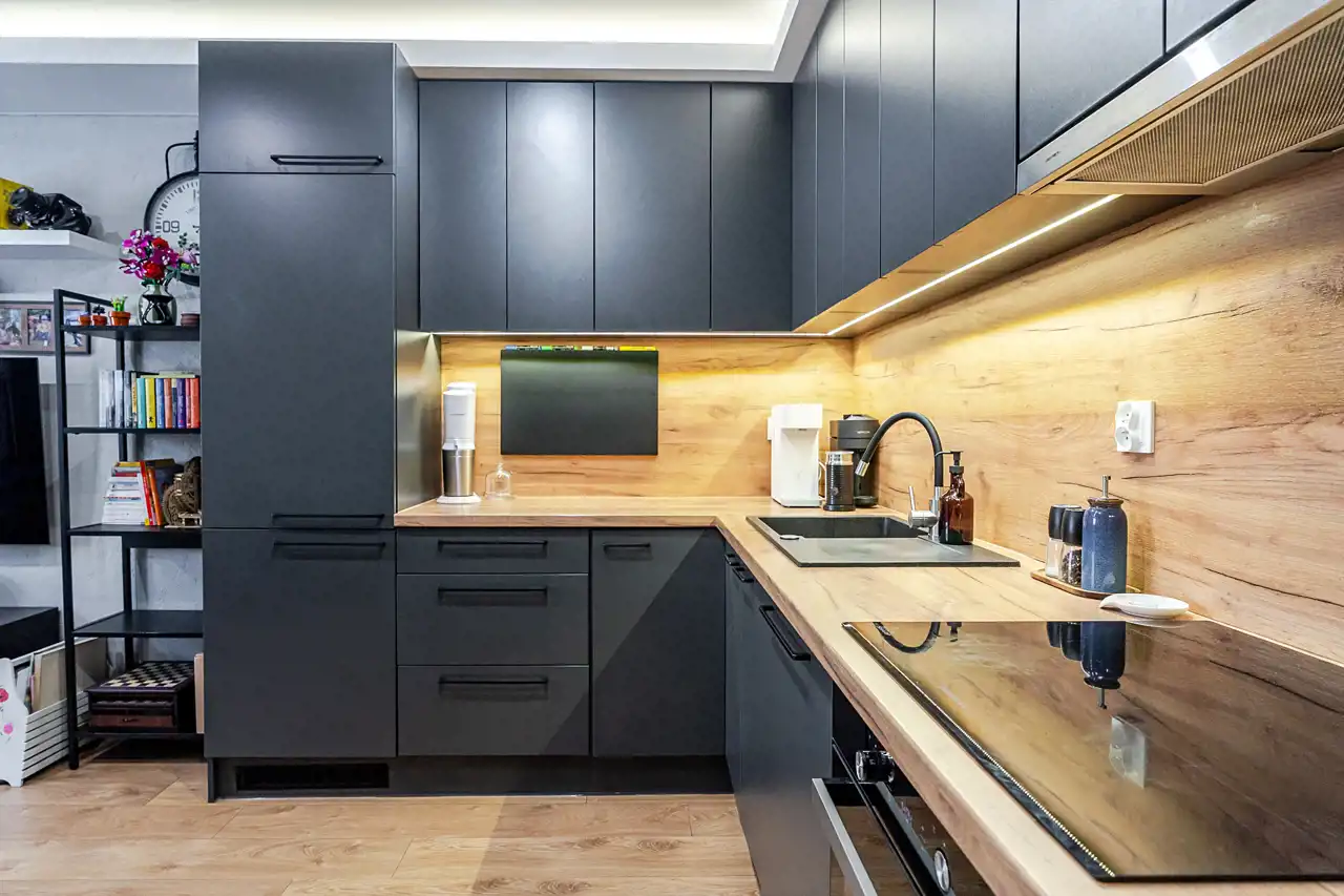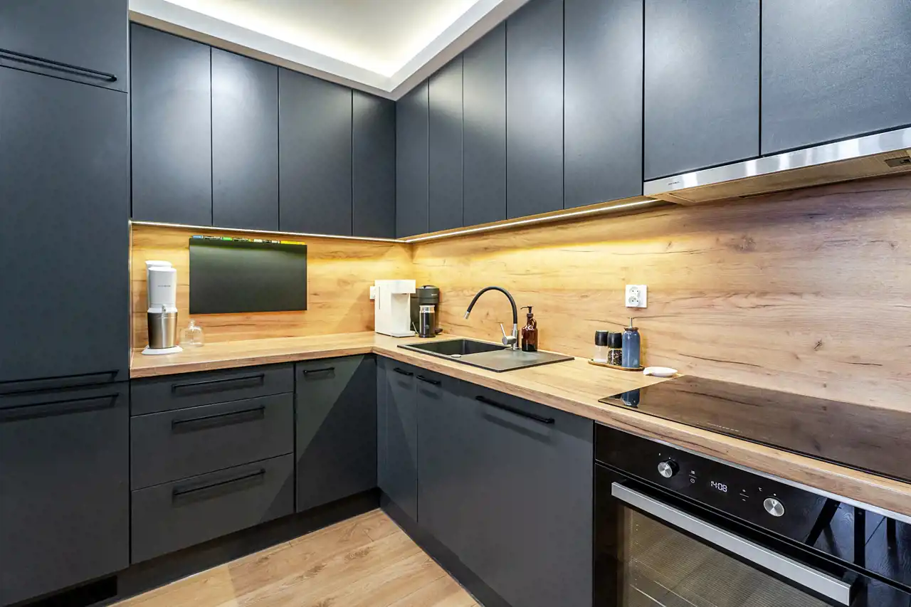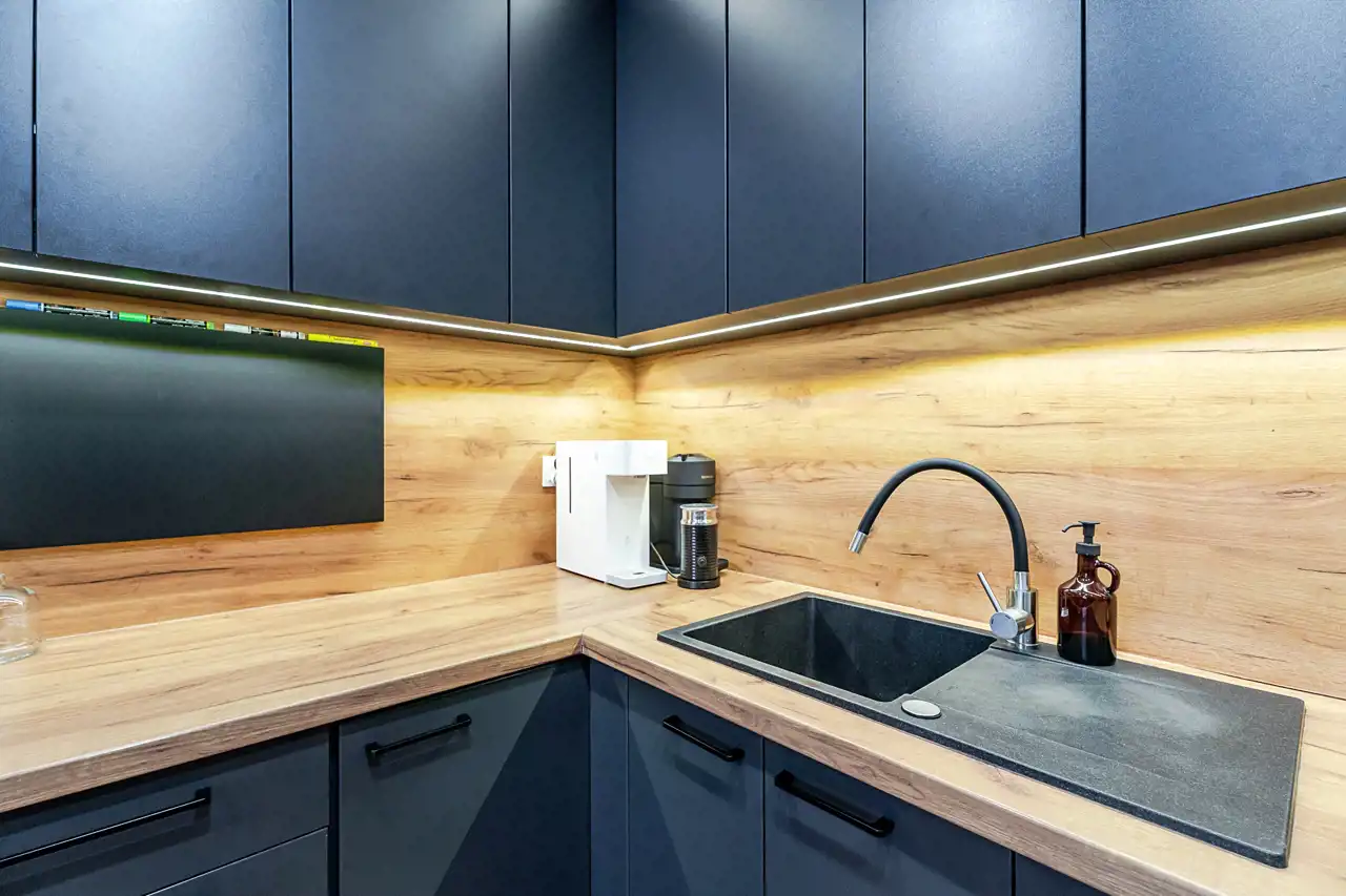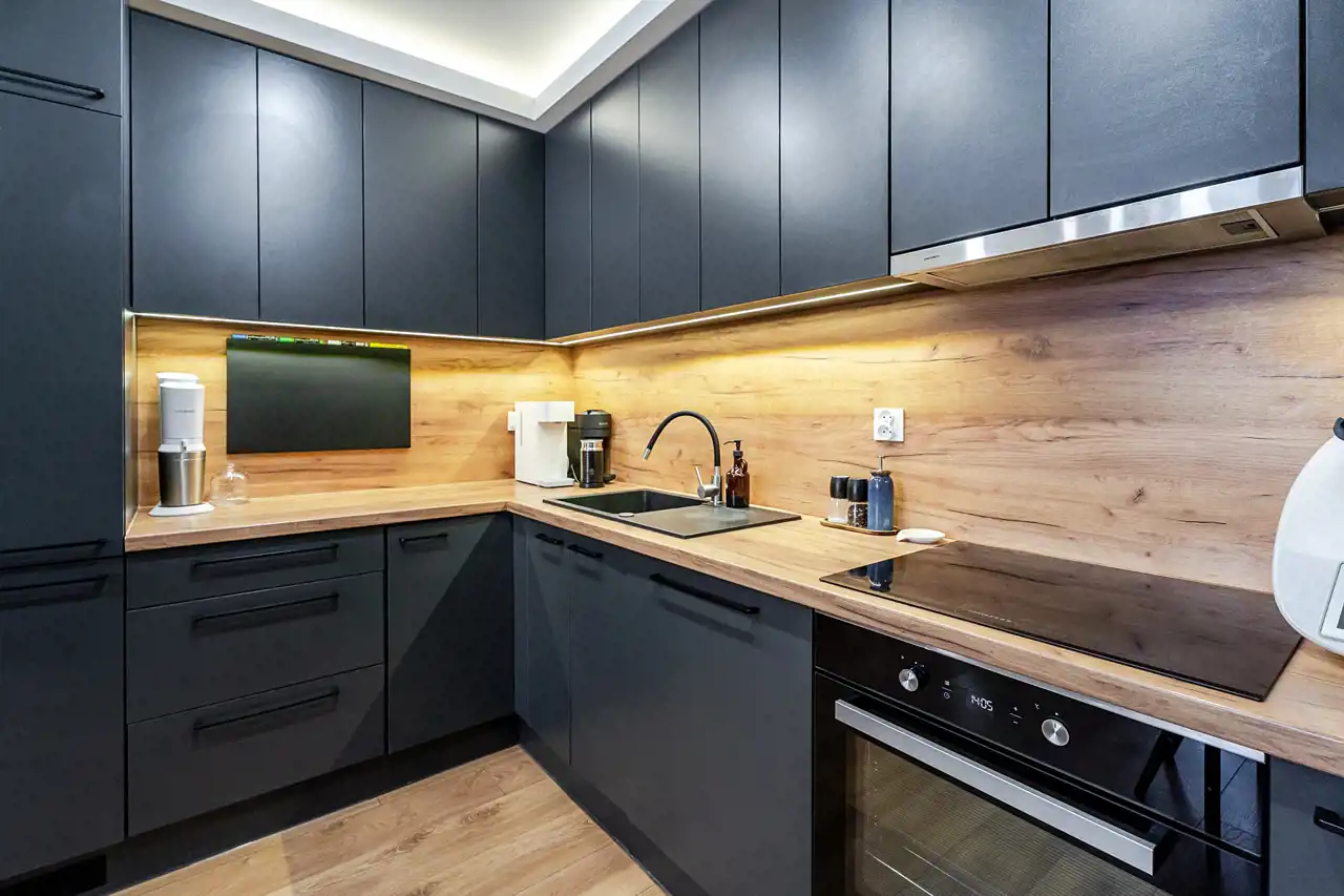 - salon z aneksem kuchennym oraz wyjściem na balkon,