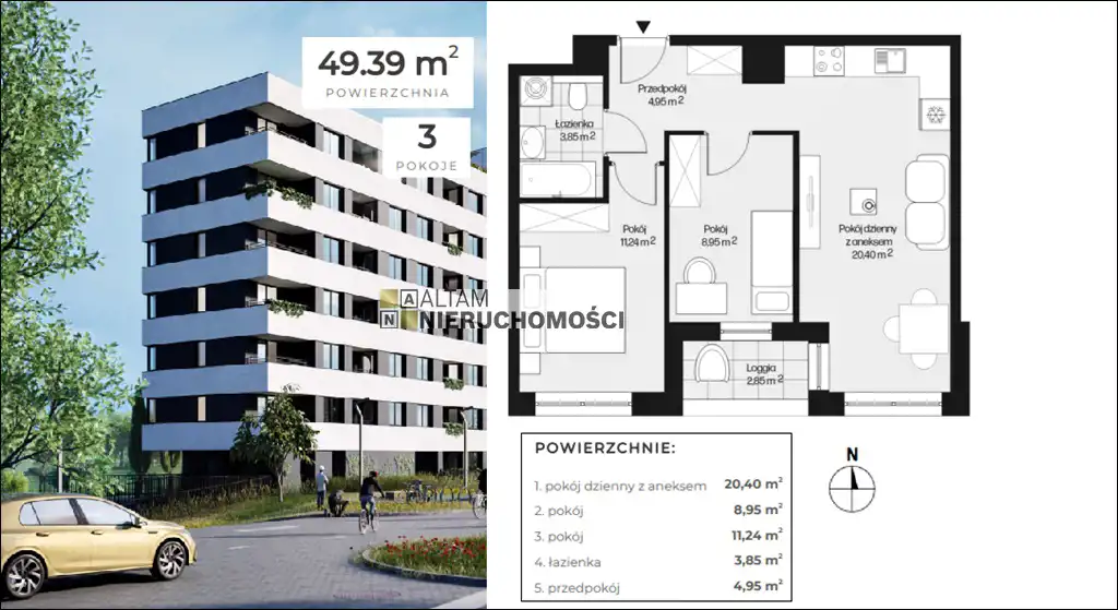 - Charakterystyka mieszkania 49.39 m2, 3 pokoje