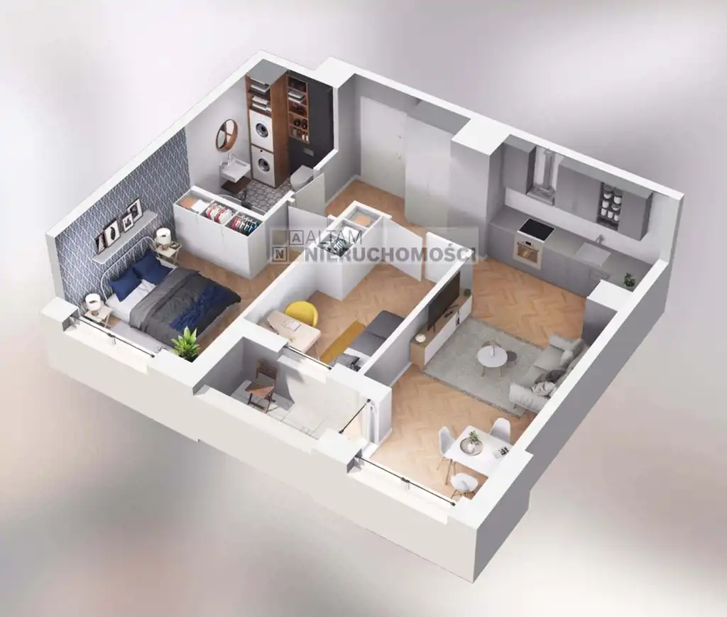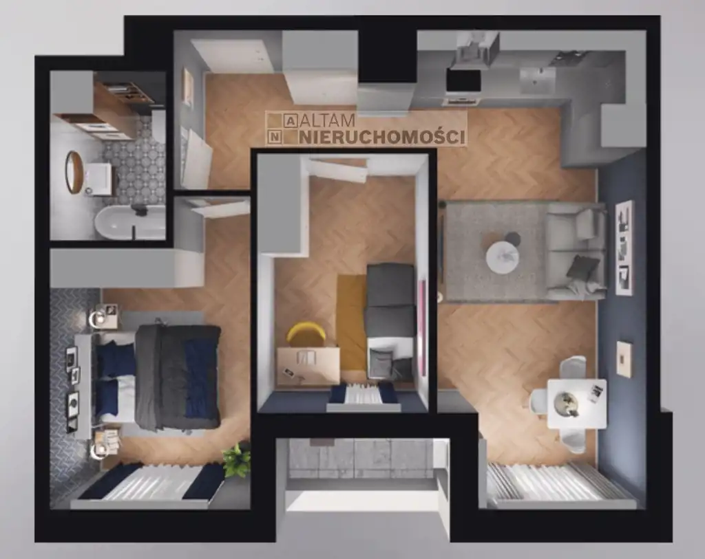 - pokój dzienny z aneksem kuchennym + 2 pokoje