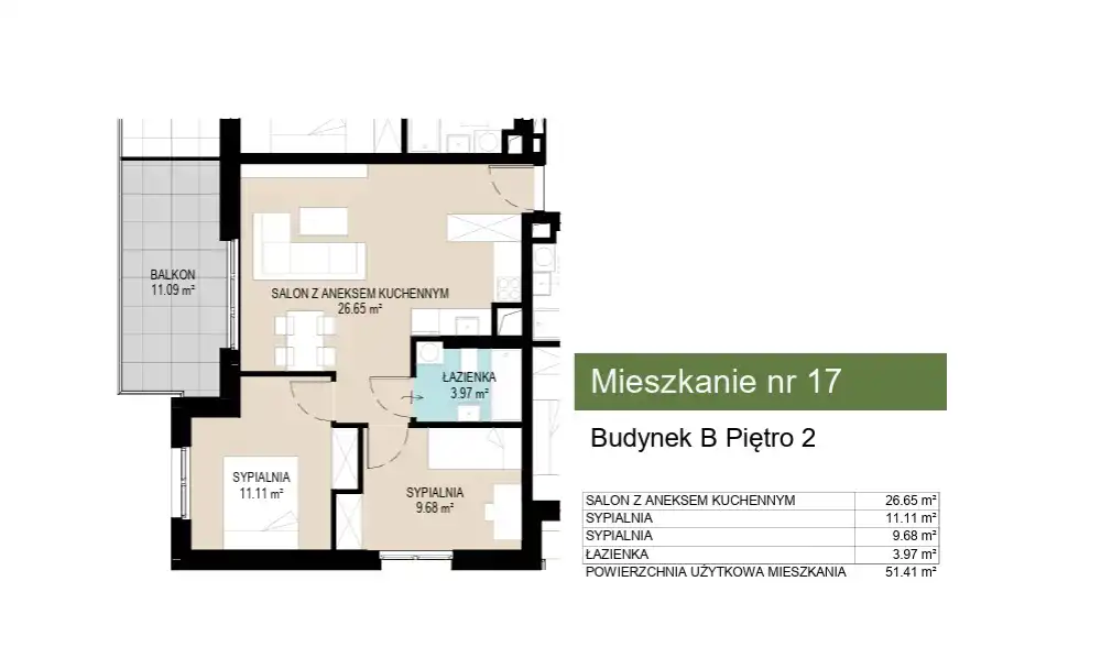 - Charakterystyka mieszkania 51.41 m2, 3 pokoje