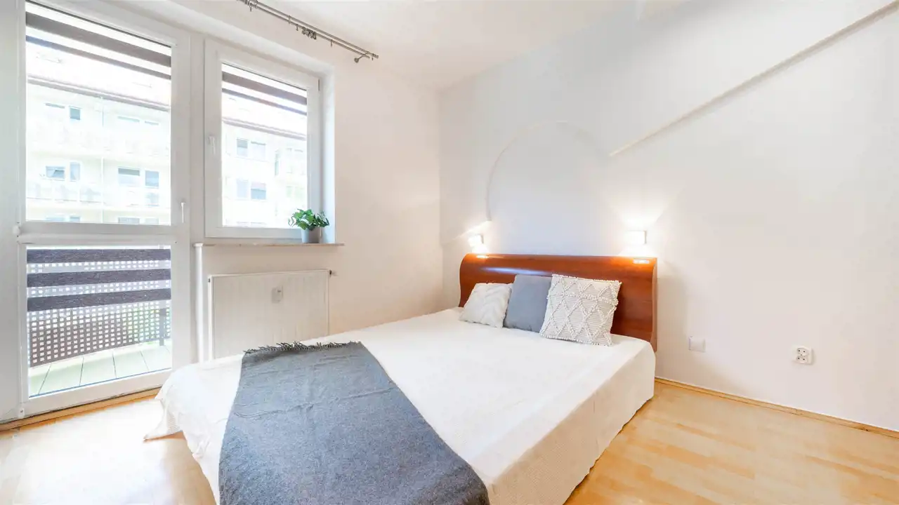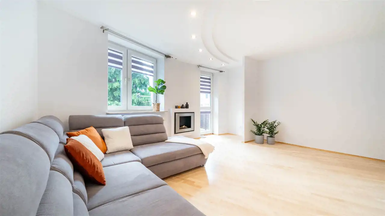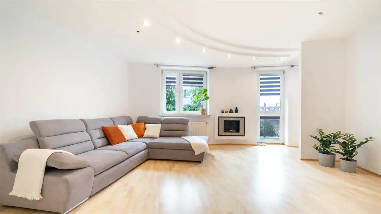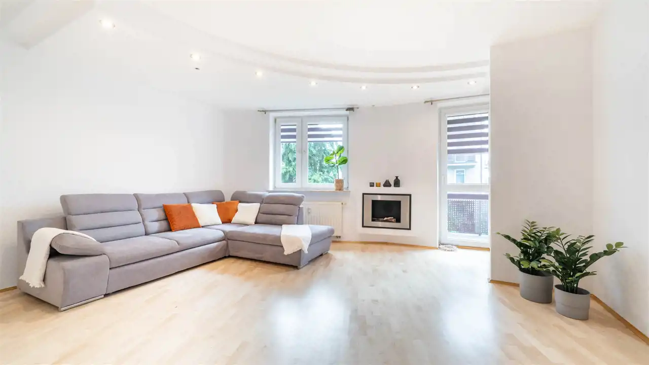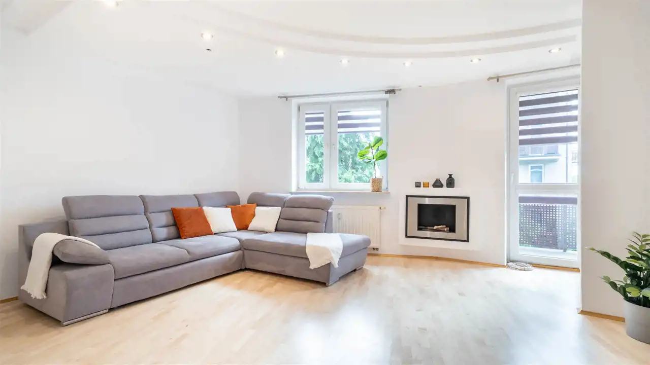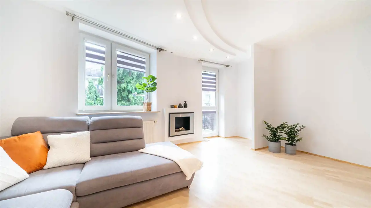 Mieszkanie ma funkcjonalny, narożny układ pomieszczeń.