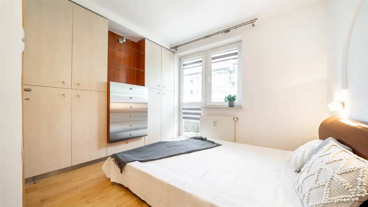 W sypialni pojemna szafa, szafki oraz wygodne łóżko.