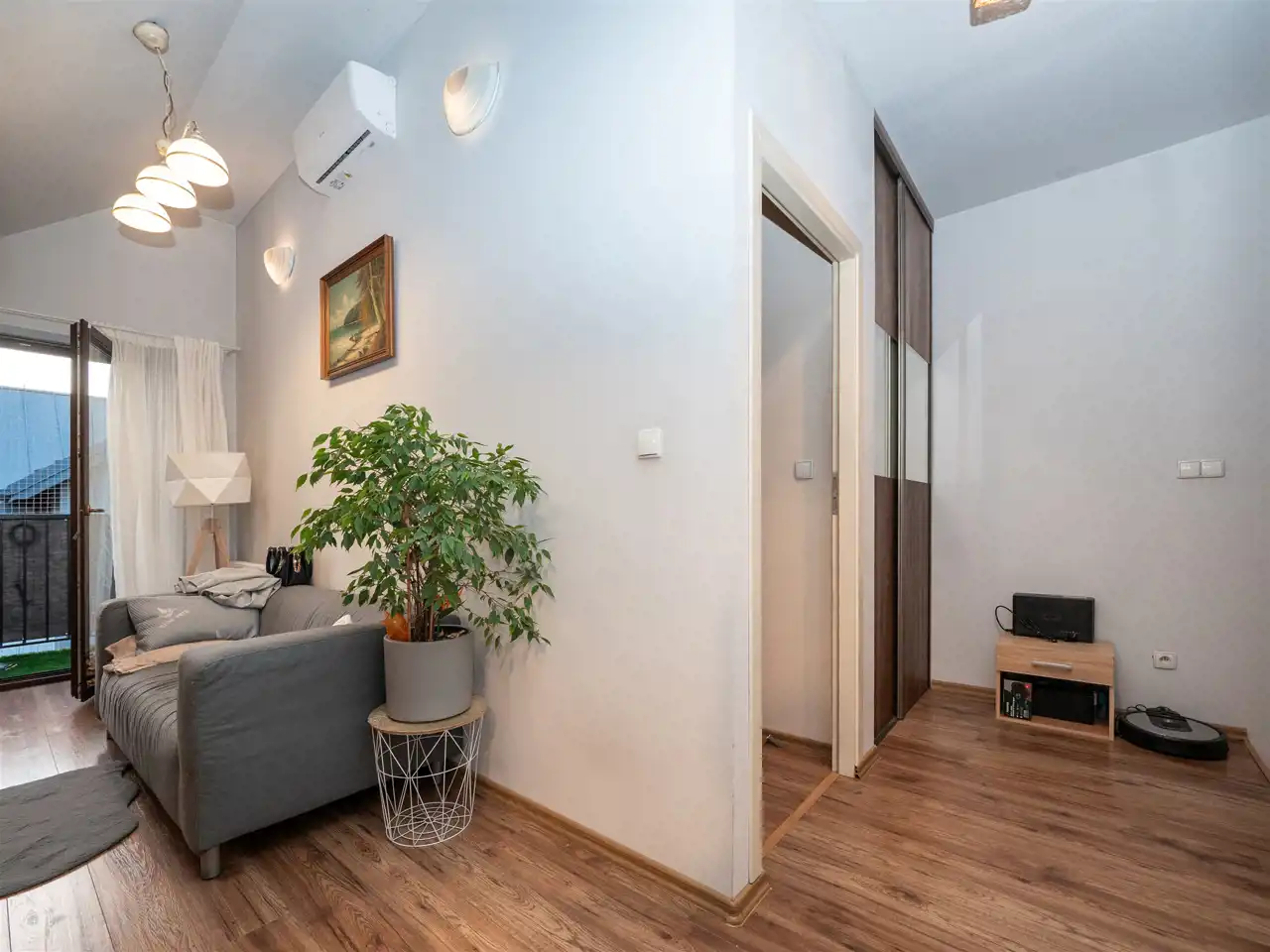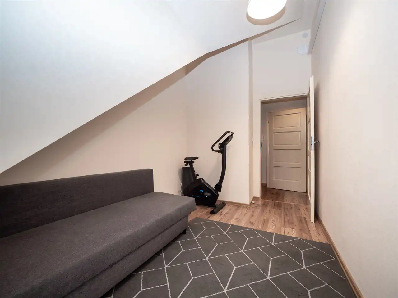 W przedpokoju na górze szafa na okrycia wierzchnie. W 1 sypialni zestaw mebli wykonanych na wymiar. Sypialnia 2 z wyjściem na balkon częściowo umeblowana. W łazience duża wanna, szafka umywalkowa z szufladami, toaleta, liczne szafki zabudowane. Ściany i podłogi wykończone dobrej jakości płytkami, ogrzewanie podłogowe.
