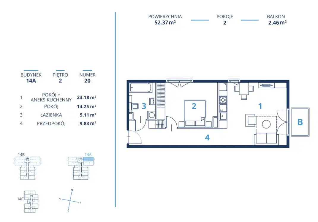 - Charakterystyka mieszkania 52.37 m2, 2 pokoje