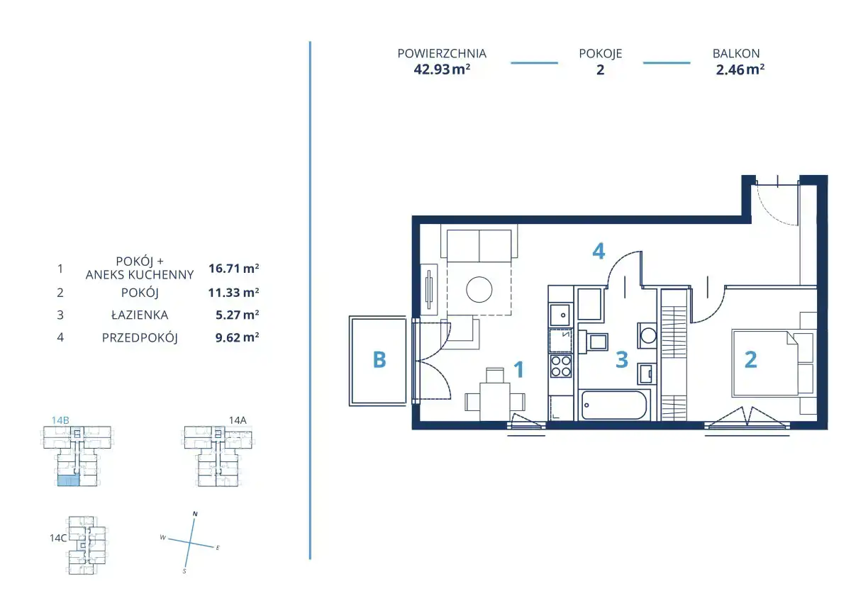 - Charakterystyka mieszkania 42.93 m2, 2 pokoje