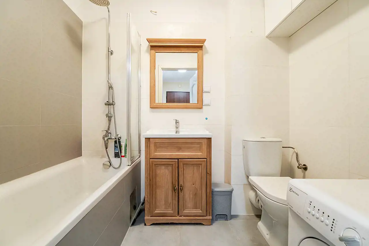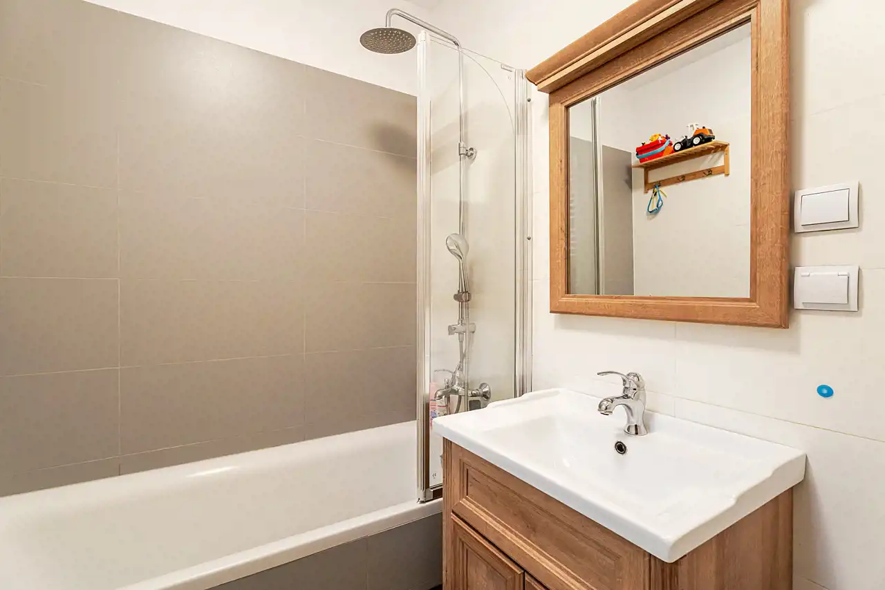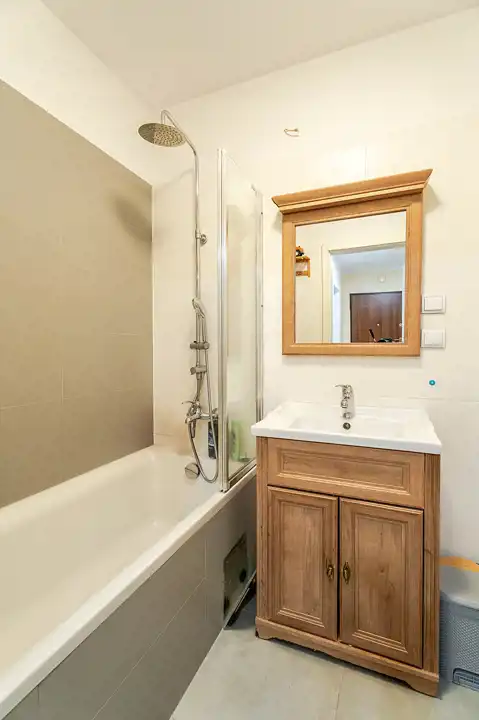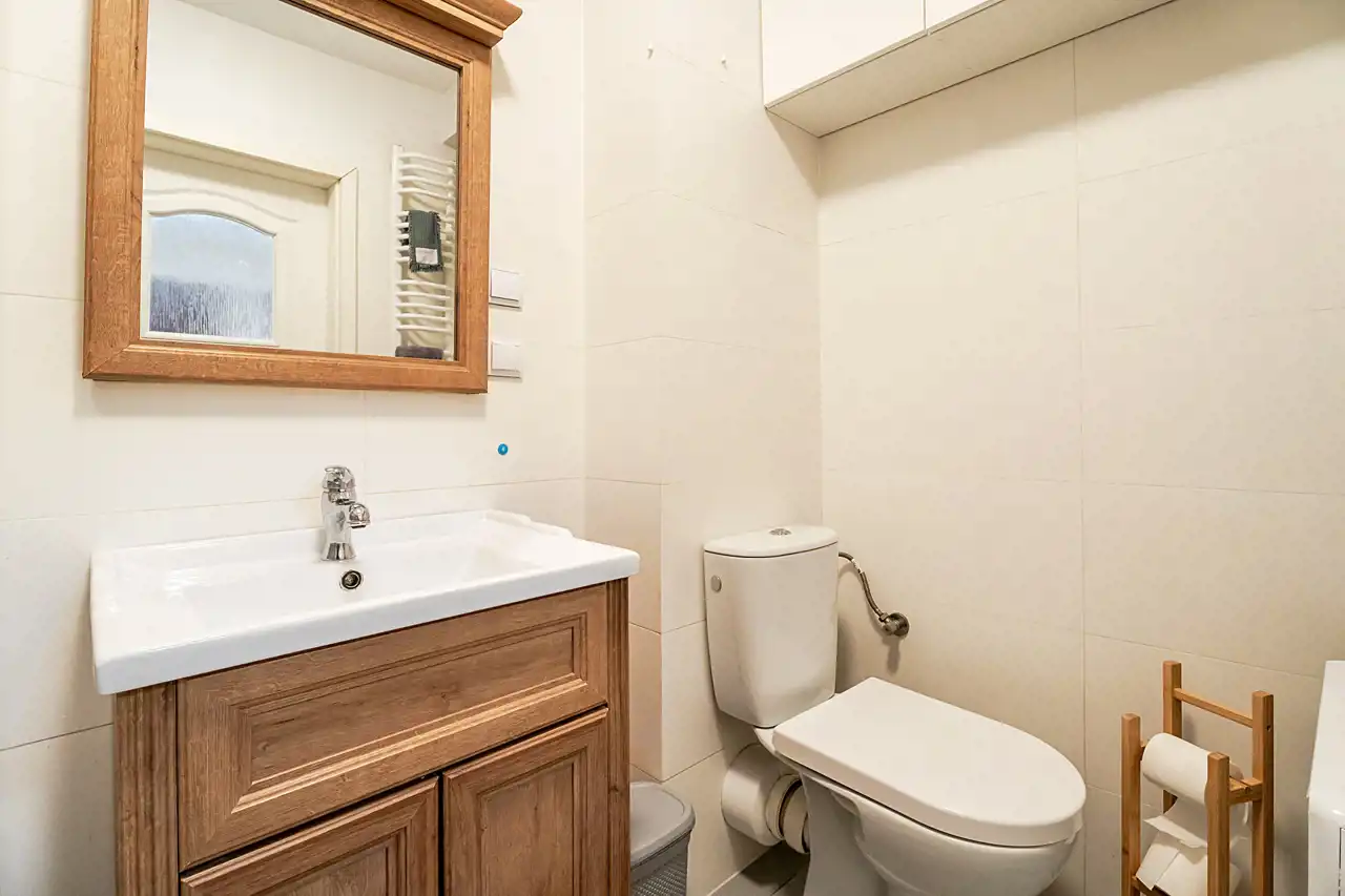 Na podłodze panele a w łazience terakota.