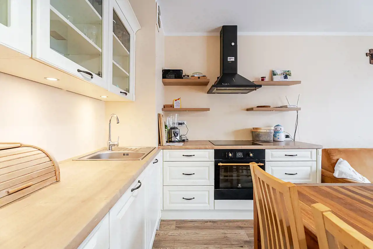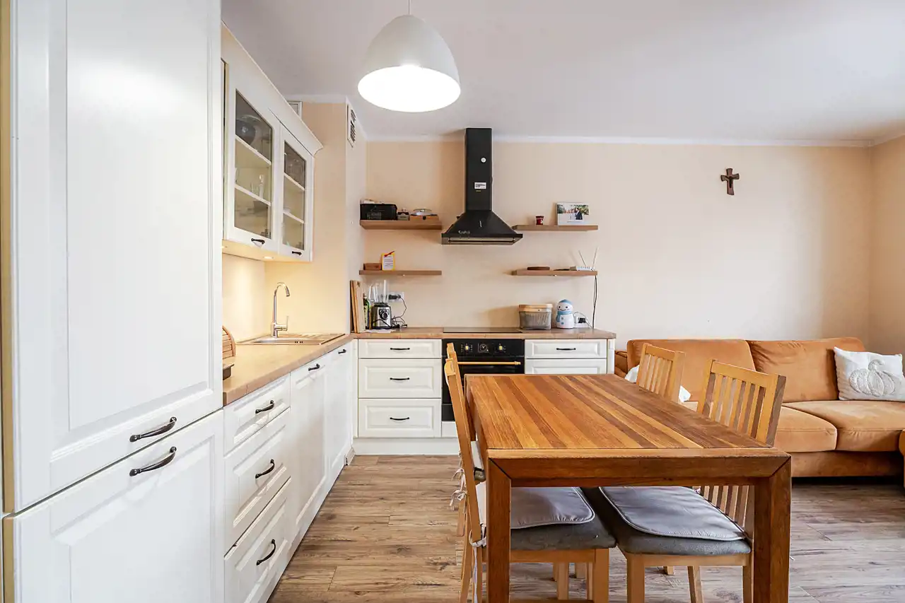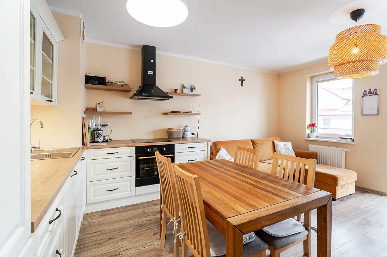 Kuchnia w pełni umeblowana i wyposażona w sprzęt AGD.
