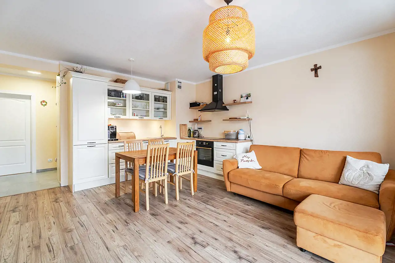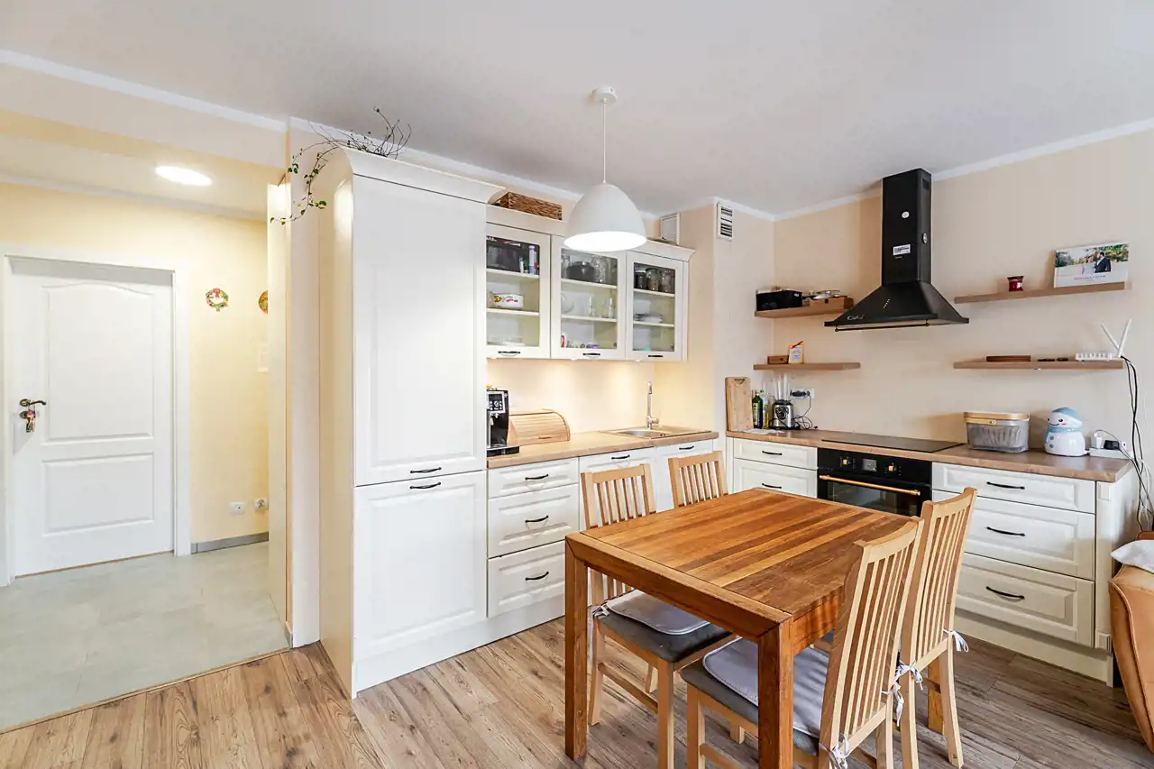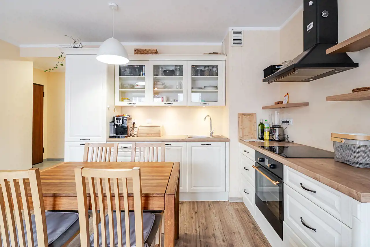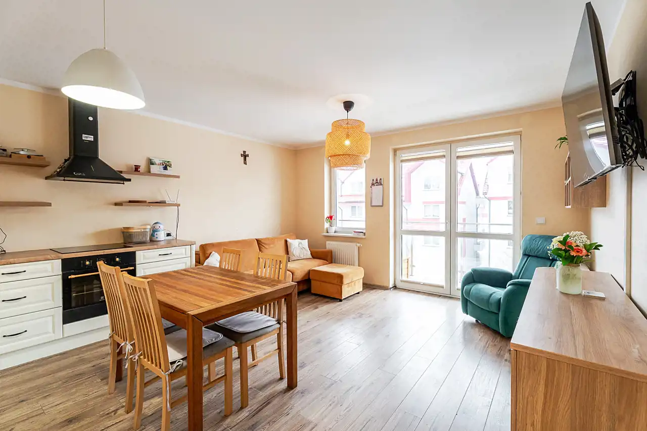 Kuchnia w pełni umeblowana i wyposażona w sprzęt AGD.