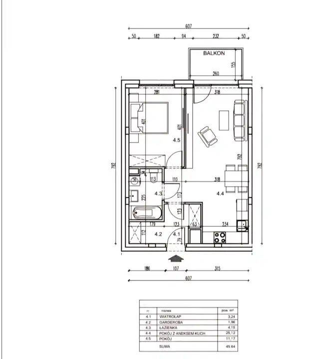 - Charakterystyka mieszkania 45.64 m2, 2 pokoje