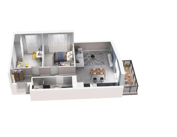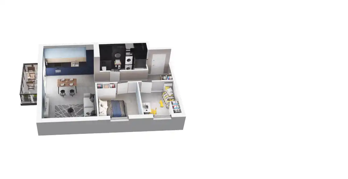 Mieszkanie składające się z salonu z aneksem kuchennym, dwóch sypialni, przedpokoju, łazienki oraz balkonu.