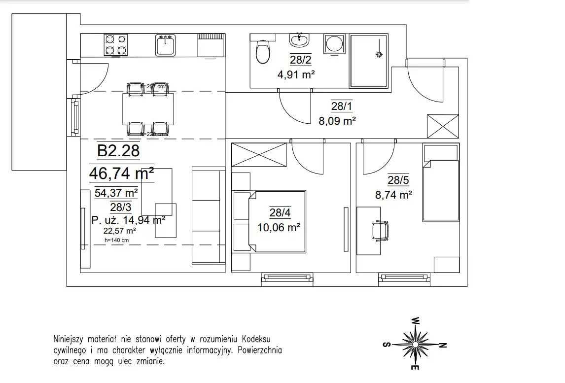 - Charakterystyka mieszkania 54.37 m2, 3 pokoje