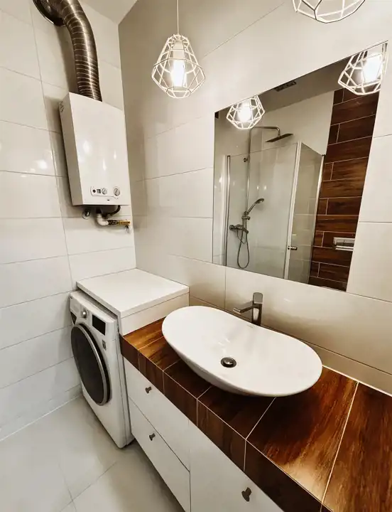 Ogrzewanie pochodzi z sieci miejskiej, a ciepła woda z piecyka gazowego.