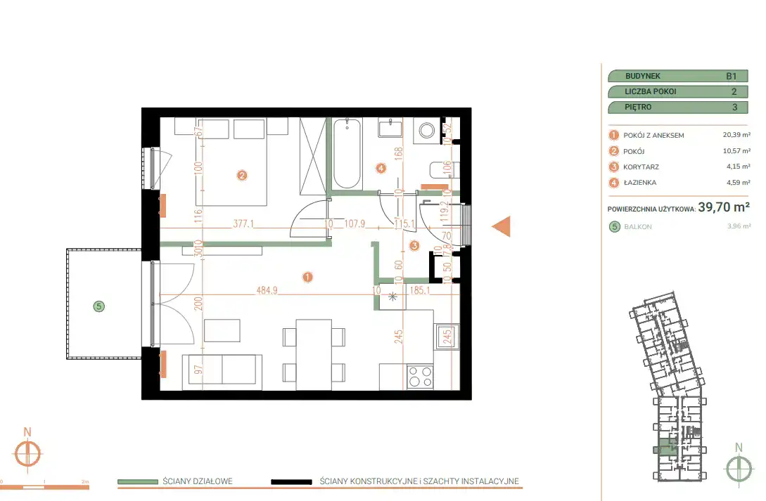 - Charakterystyka mieszkania 39.7 m2, 2 pokoje