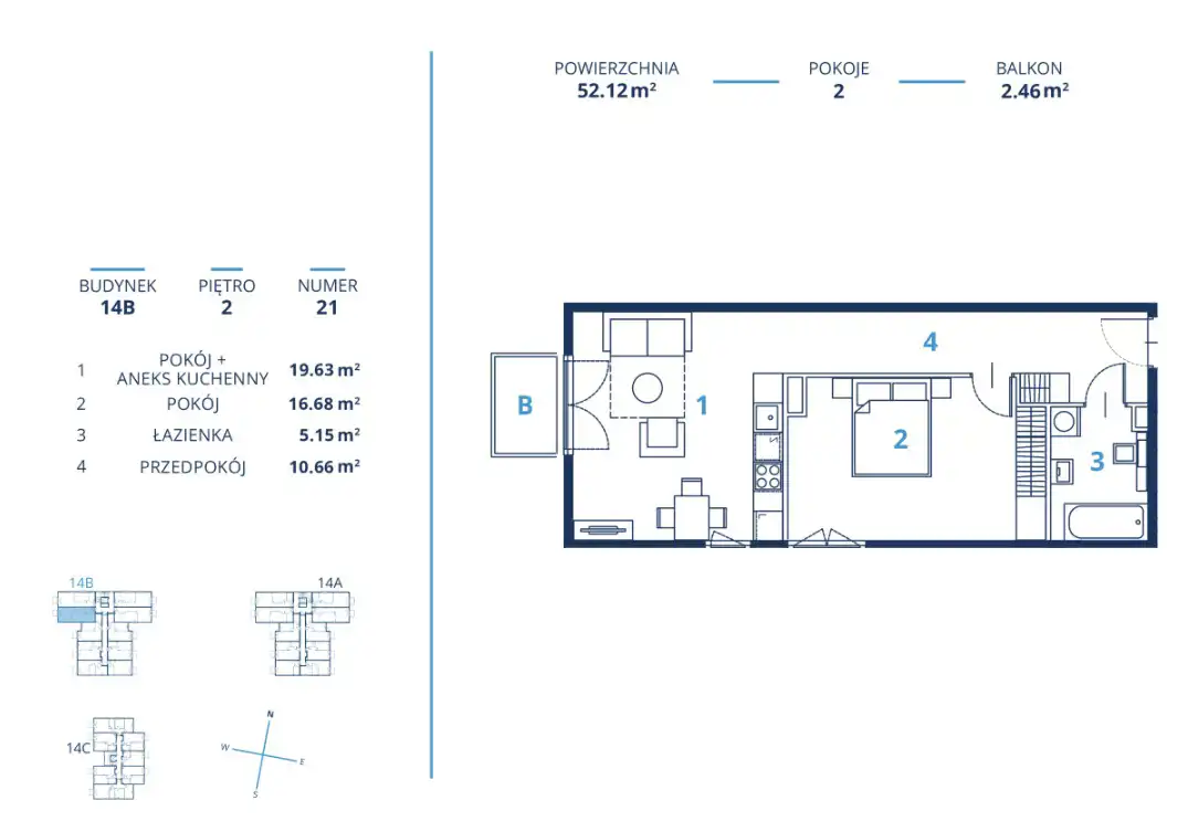 - Charakterystyka mieszkania 52.12 m2, 2 pokoje