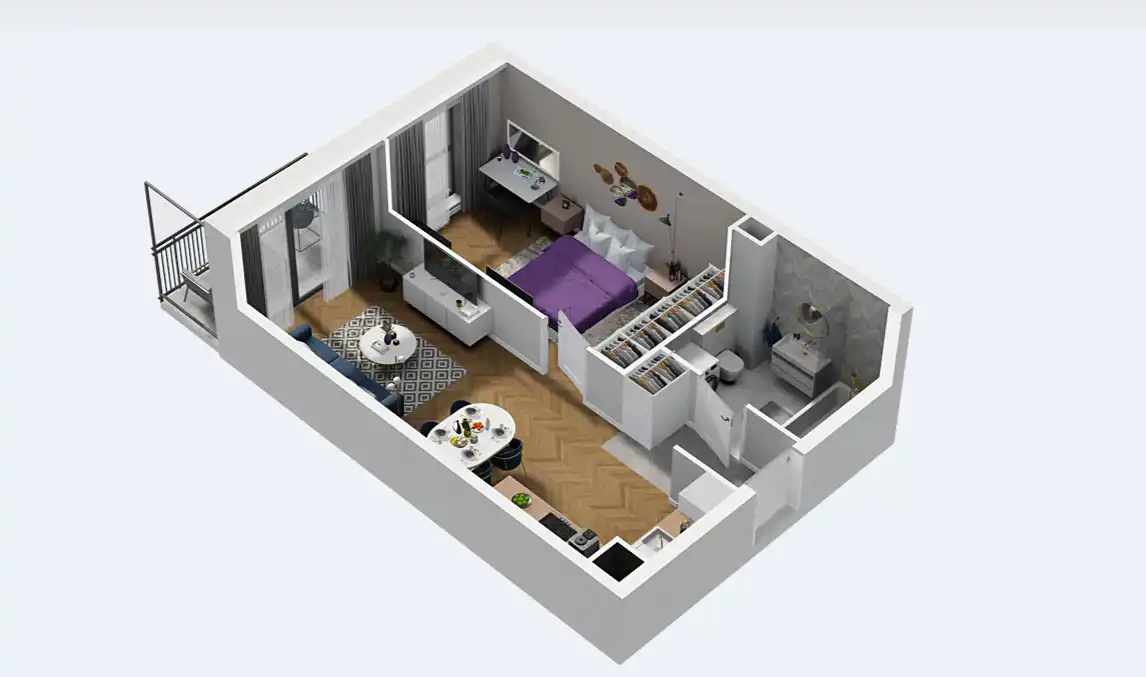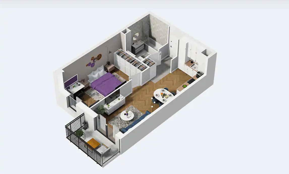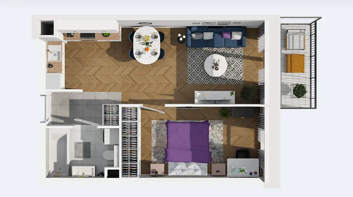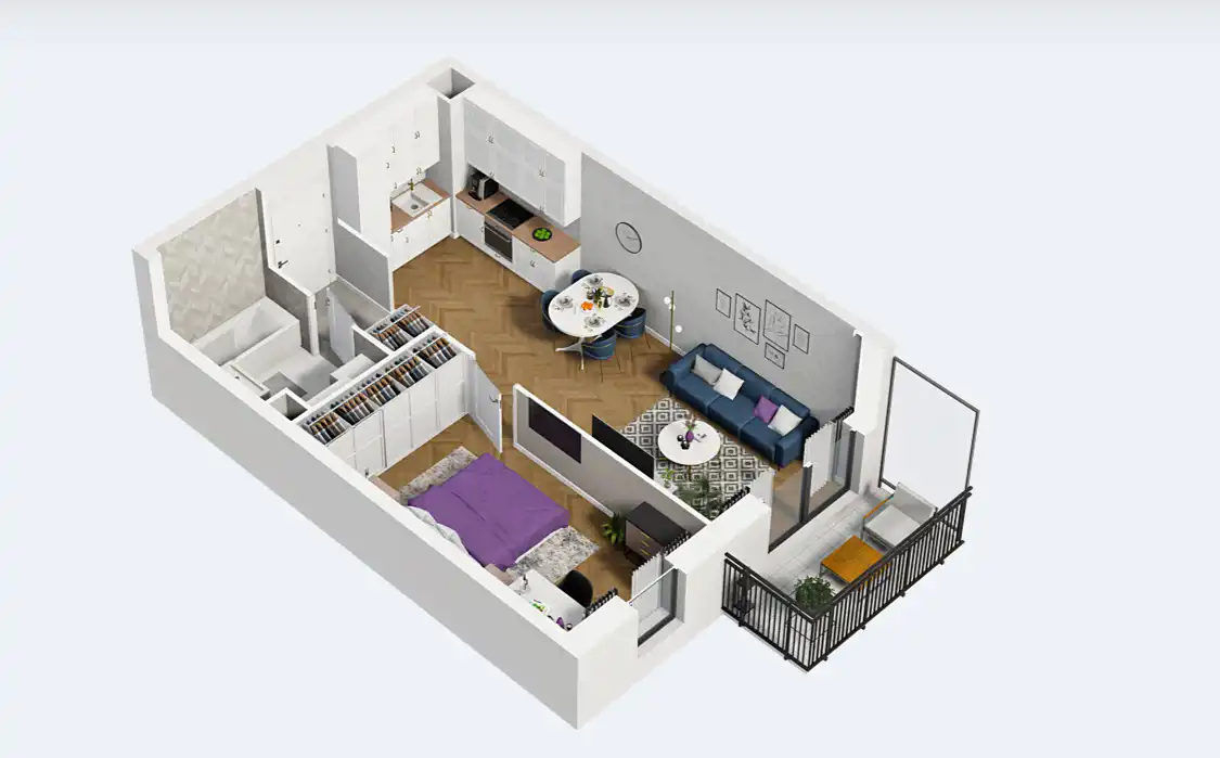 Mieszkanie składające się z salonu z aneksem kuchennym , sypialni, łazienki oraz balkonu.