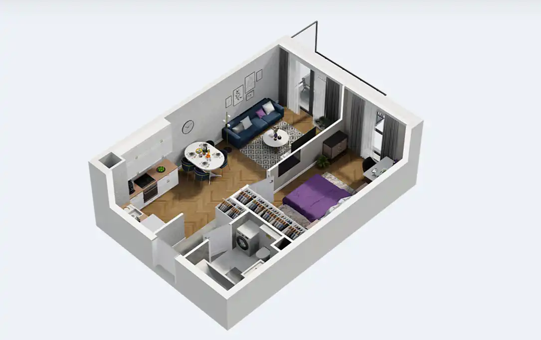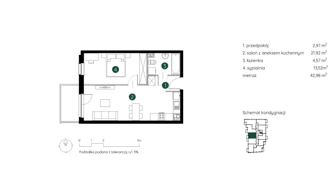 - Charakterystyka mieszkania 43.1 m2, 2 pokoje